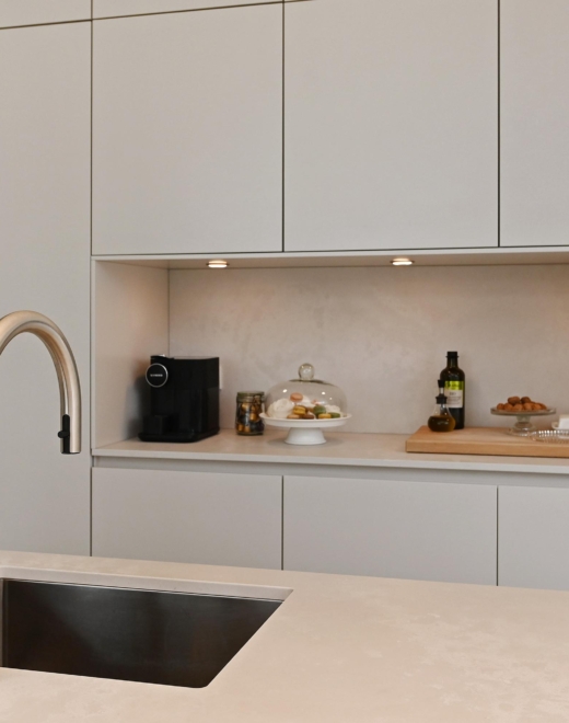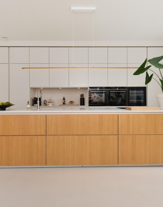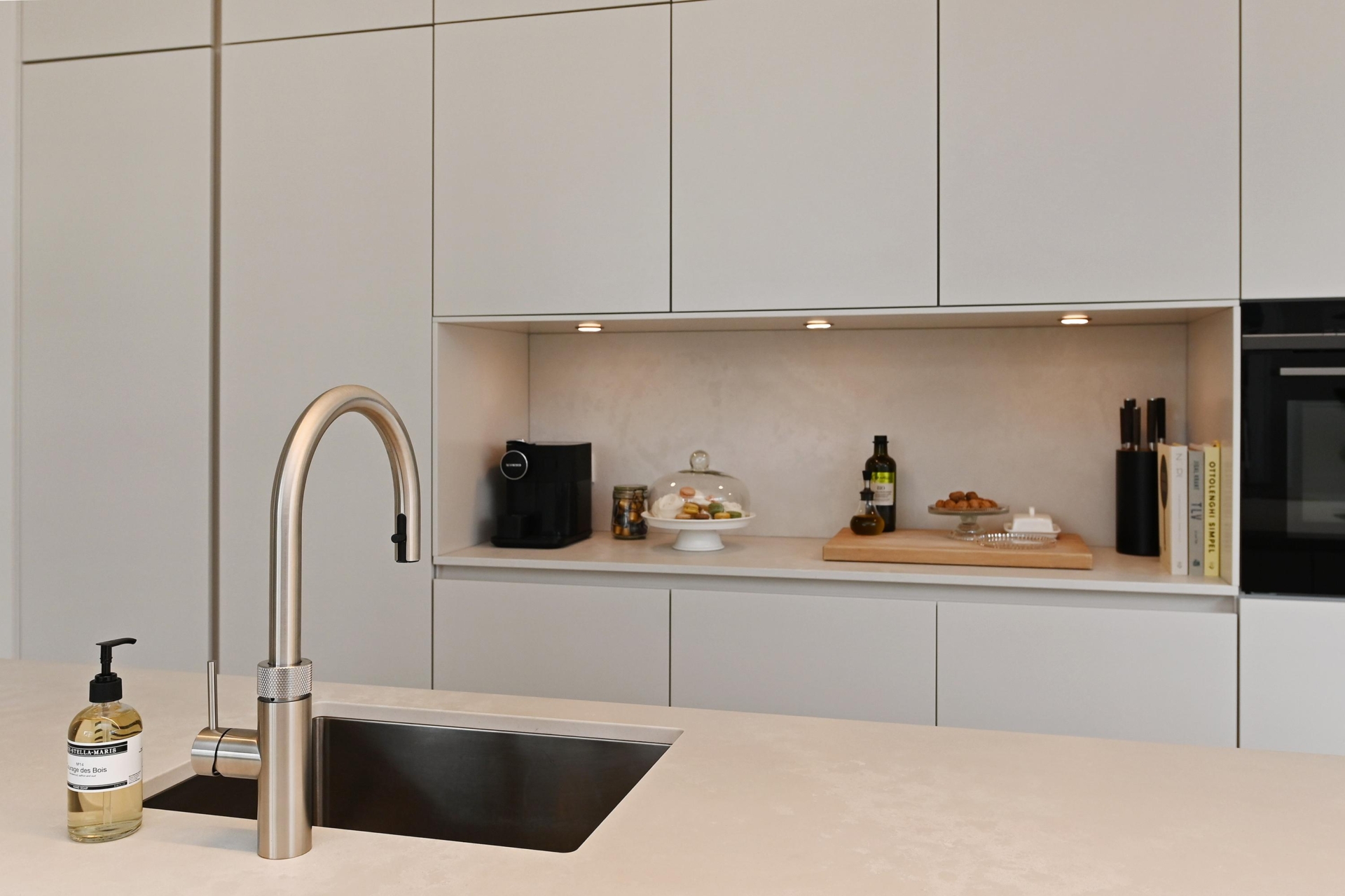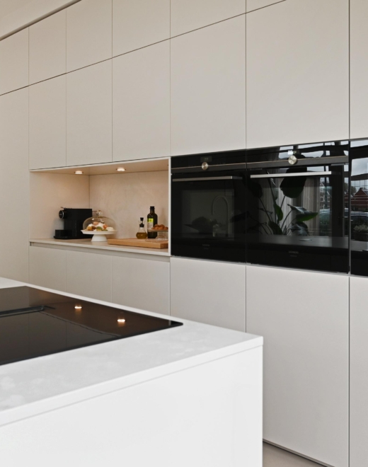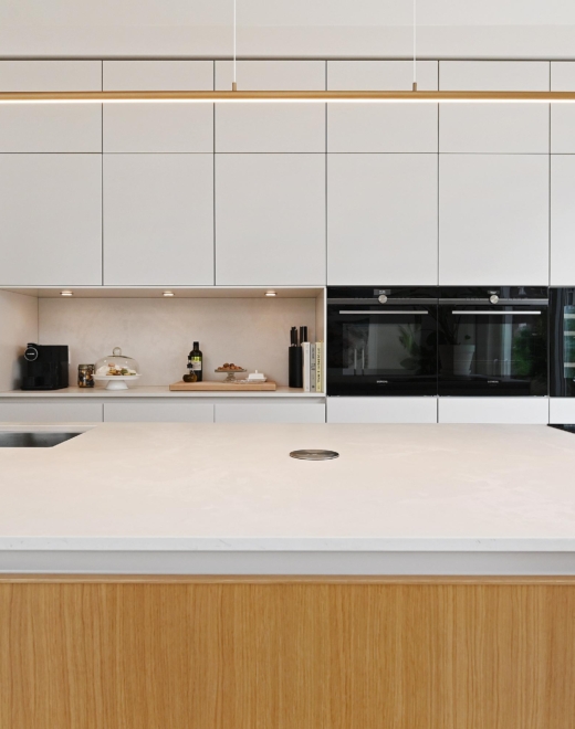 The open-plan kitchen is a dream for every cooking enthusiast. This exceptional 125next kitchen features an impressive island, oak fronts and a composite worktop by Jetstone. It is equipped with premium Siemens appliances, including a large induction hob with integrated extractor, two ovens, one of which has a microwave function, a Quooker tap, and extra-large fridge and freezer units. A Dunavox wine cooler completes the space, turning every cooking moment into a true experience.