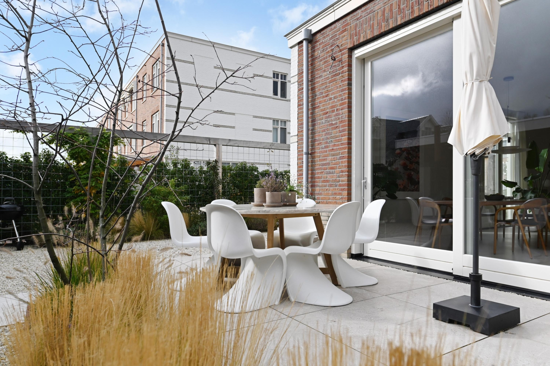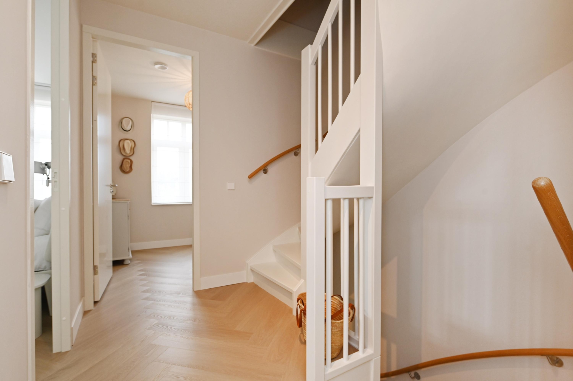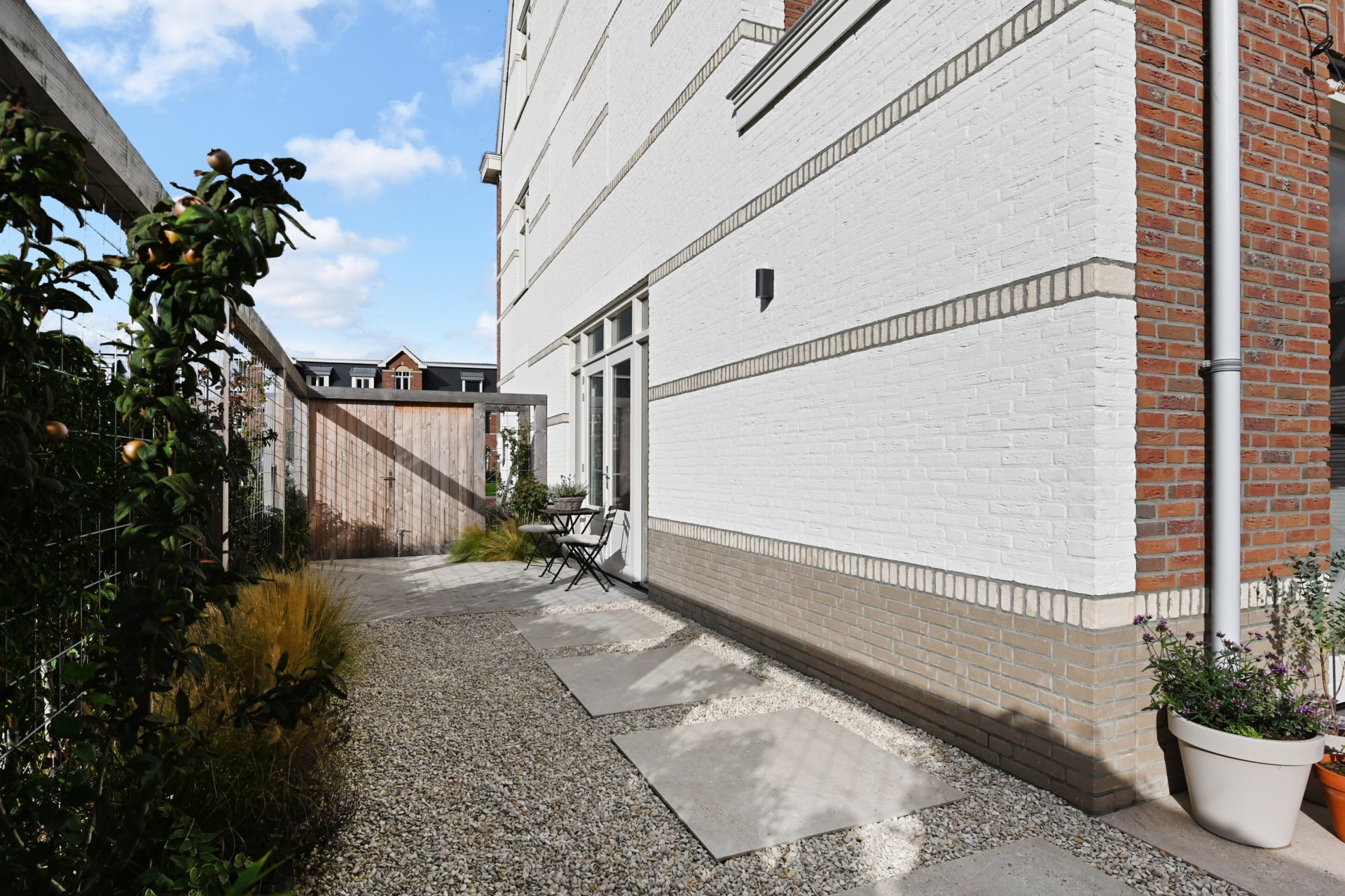 Through the well-kept front garden, featuring a charming seating area, you reach the entrance of the home. There is private parking for no fewer than three cars, including an electric charging point. The hallway offers a modern guest toilet with wash basin and a spacious storage room housing the heat pump and a large 400-litre boiler.