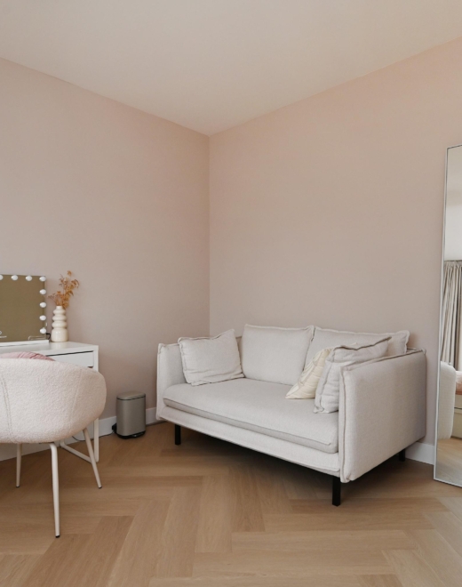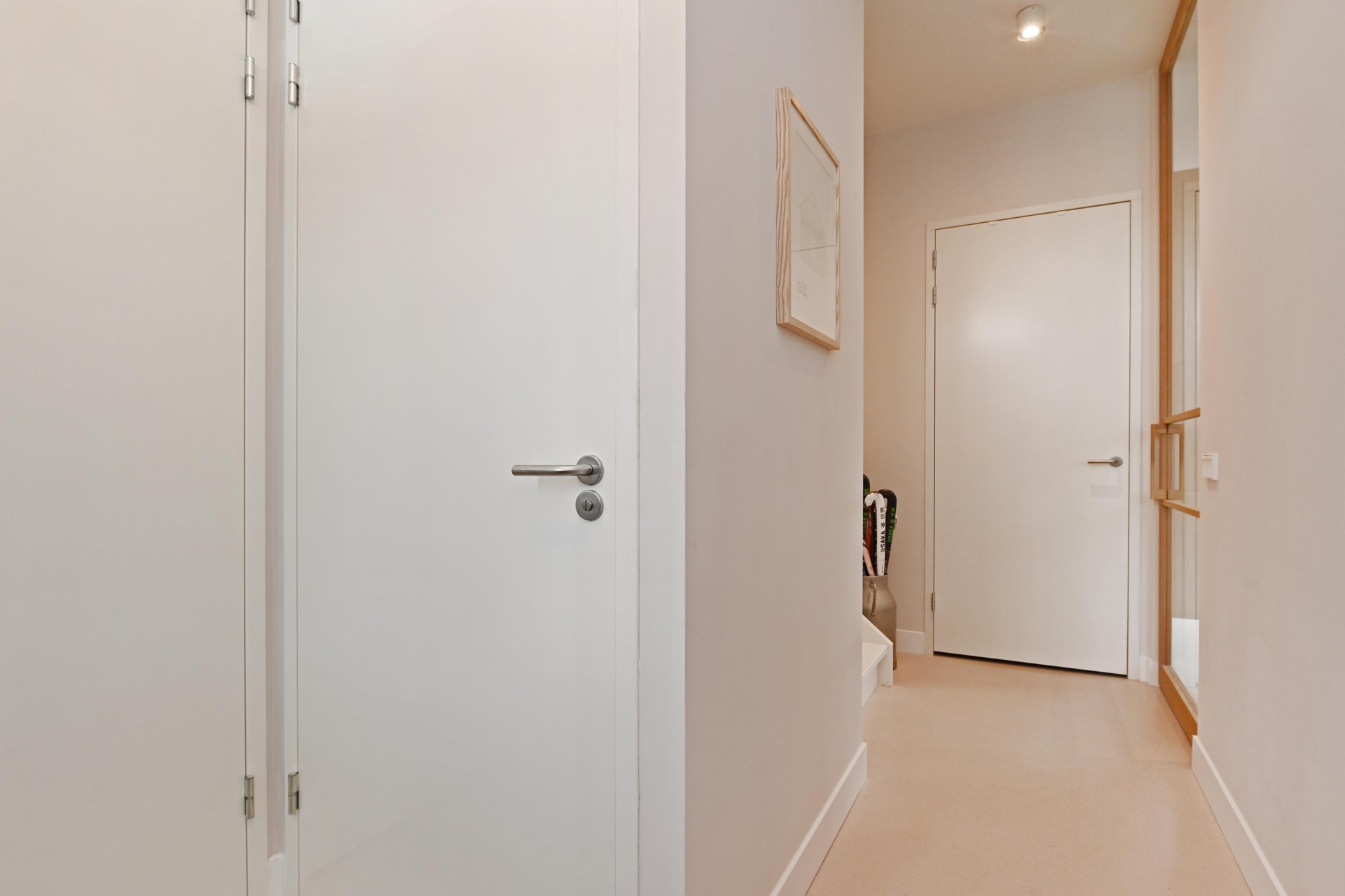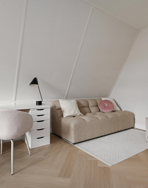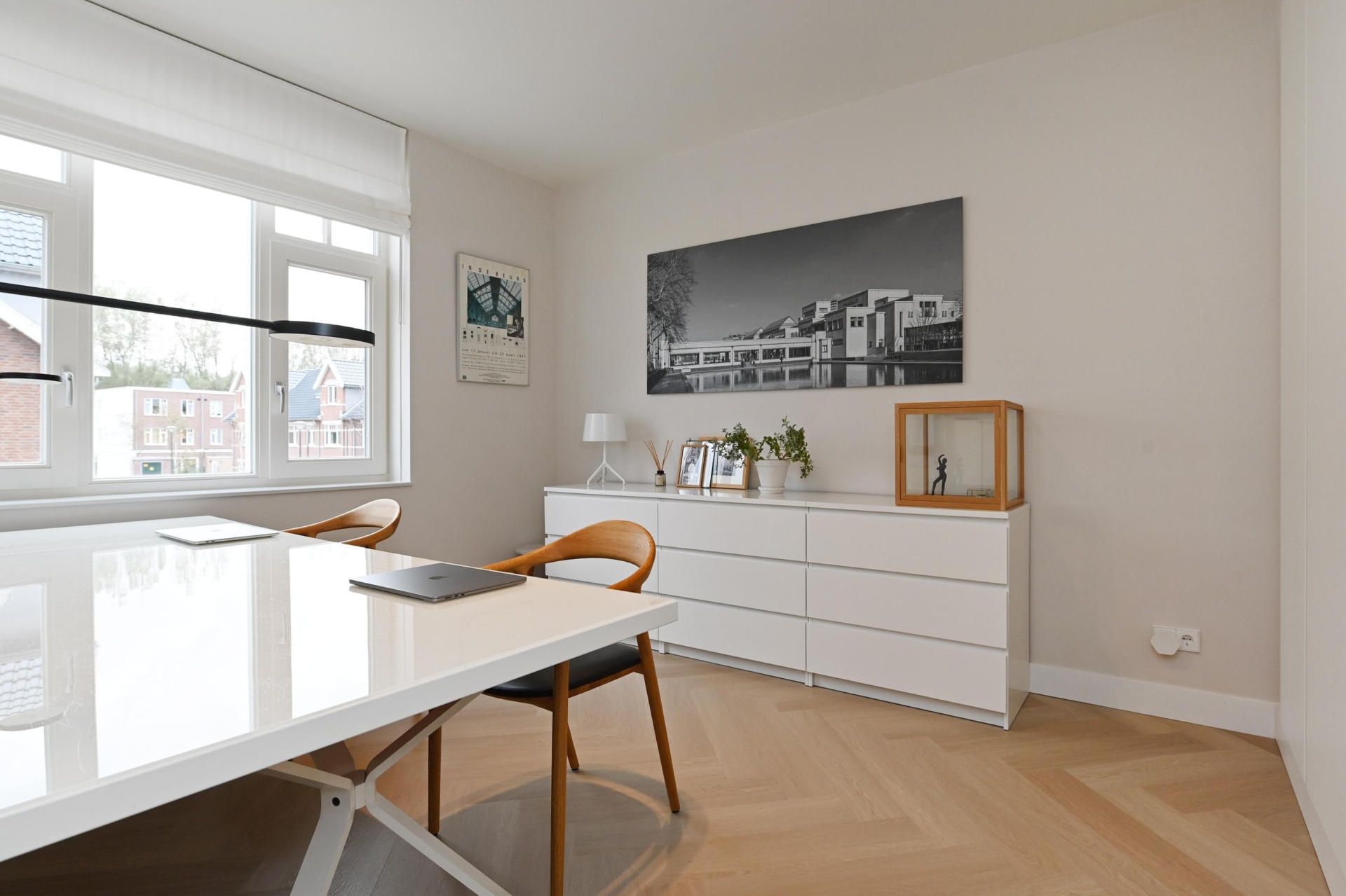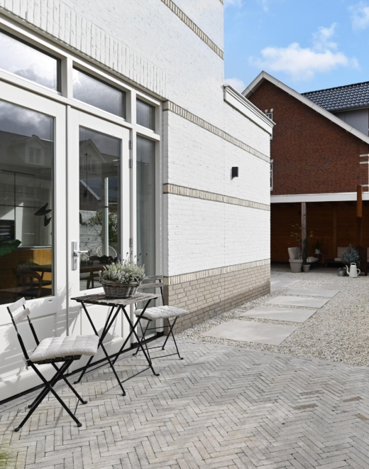 Through the well-kept front garden, featuring a charming seating area, you reach the entrance of the home. There is private parking for no fewer than three cars, including an electric charging point. The hallway offers a modern guest toilet with wash basin and a spacious storage room housing the heat pump and a large 400-litre boiler.