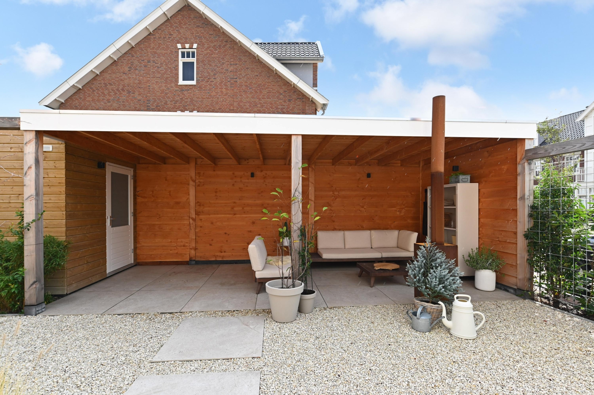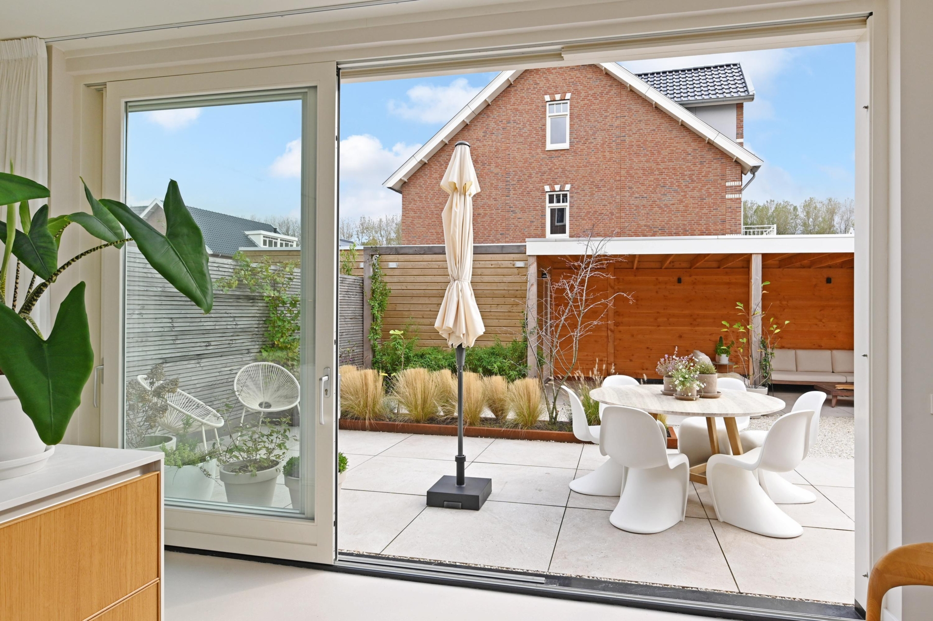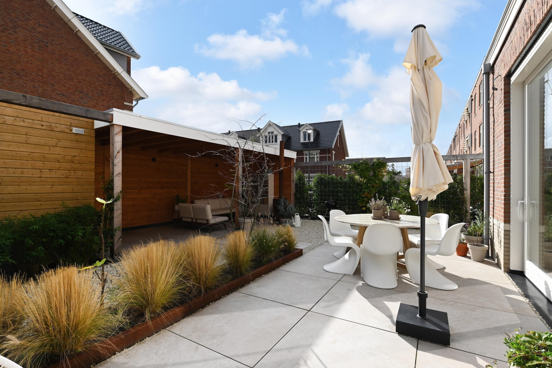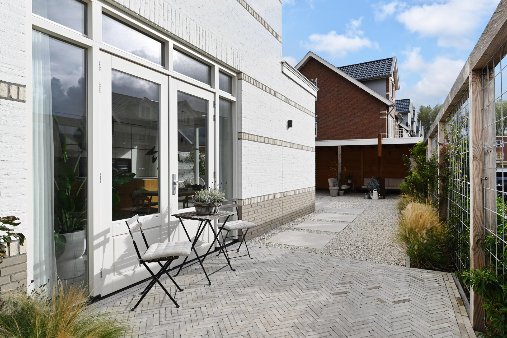 Via een prachtige eiken taatsdeur bereik je de woonkamer, waar direct het wauw-effect voelbaar is. De woonkamer is ruim en licht, met een open karakter en grote raampartijen die zorgen voor een overvloed aan daglicht. Door de openslaande deuren is de zonnige zijtuin op het westen bereikbaar en via dubbele schuifpuien stap je de brede, fraai aangelegde achtertuin op het zuiden in. De tuin is een heerlijke plek om te ontspannen, met een gezellige overkapping, een (fietsen)schuur voorzien van elektra, een buitenkraan en een doorgang naar de voorzijde via de zijtuin en de oprit.