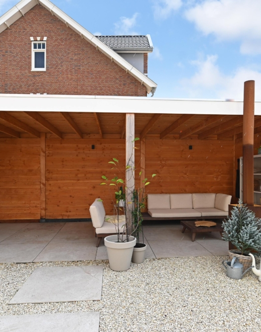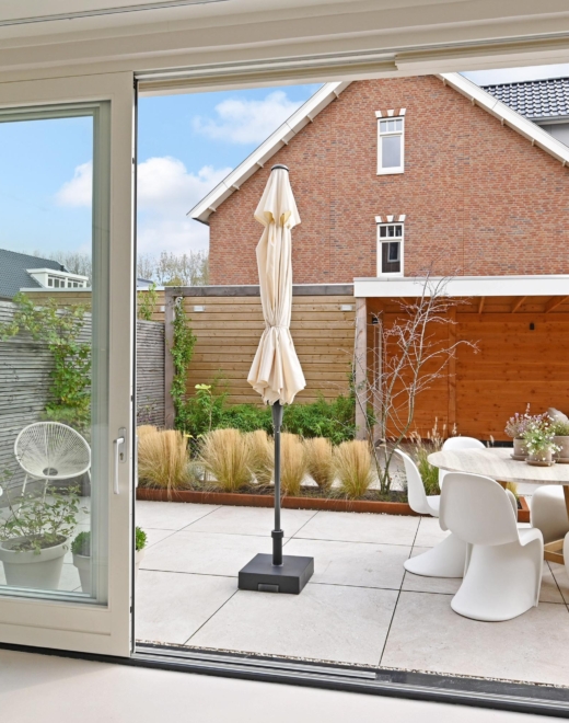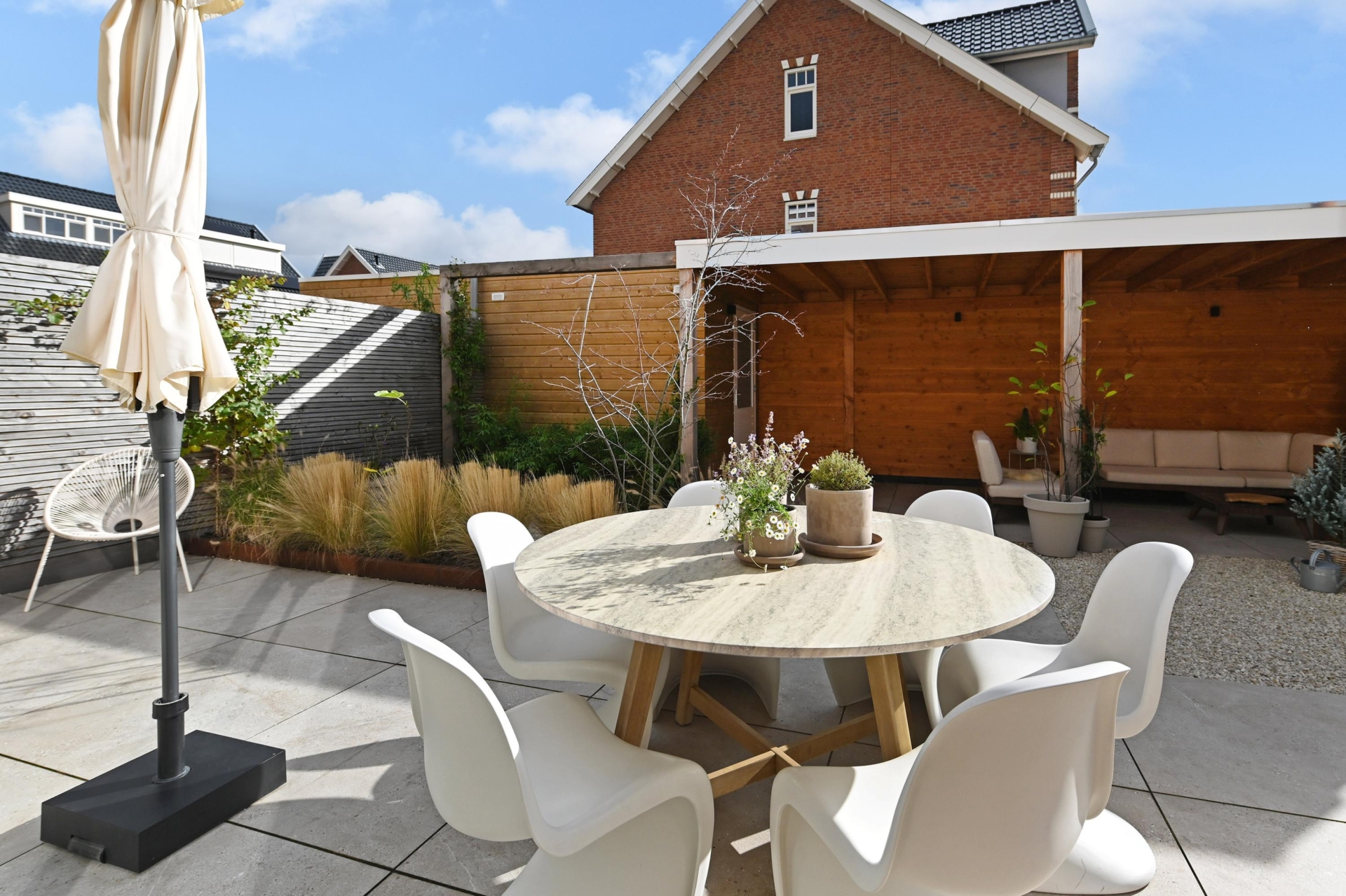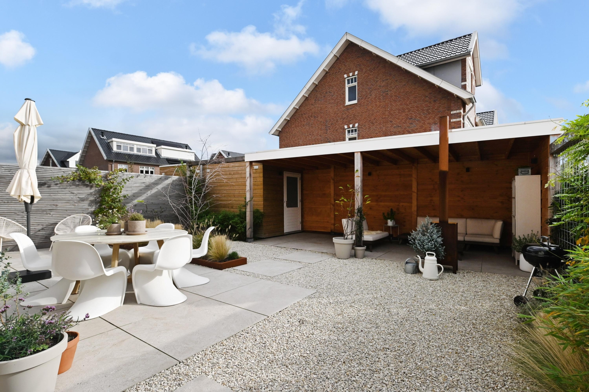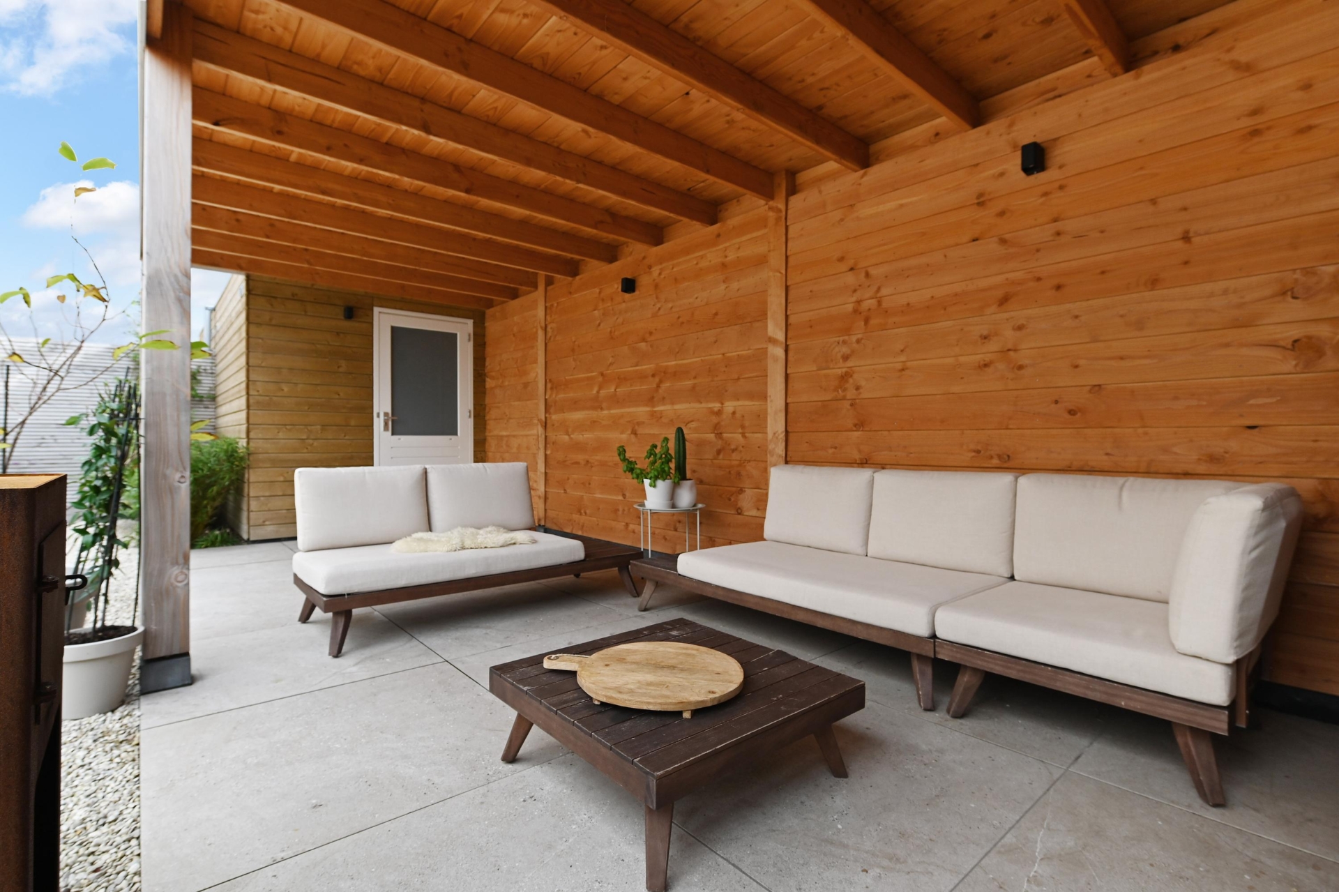 Via een prachtige eiken taatsdeur bereik je de woonkamer, waar direct het wauw-effect voelbaar is. De woonkamer is ruim en licht, met een open karakter en grote raampartijen die zorgen voor een overvloed aan daglicht. Door de openslaande deuren is de zonnige zijtuin op het westen bereikbaar en via dubbele schuifpuien stap je de brede, fraai aangelegde achtertuin op het zuiden in. De tuin is een heerlijke plek om te ontspannen, met een gezellige overkapping, een (fietsen)schuur voorzien van elektra, een buitenkraan en een doorgang naar de voorzijde via de zijtuin en de oprit.