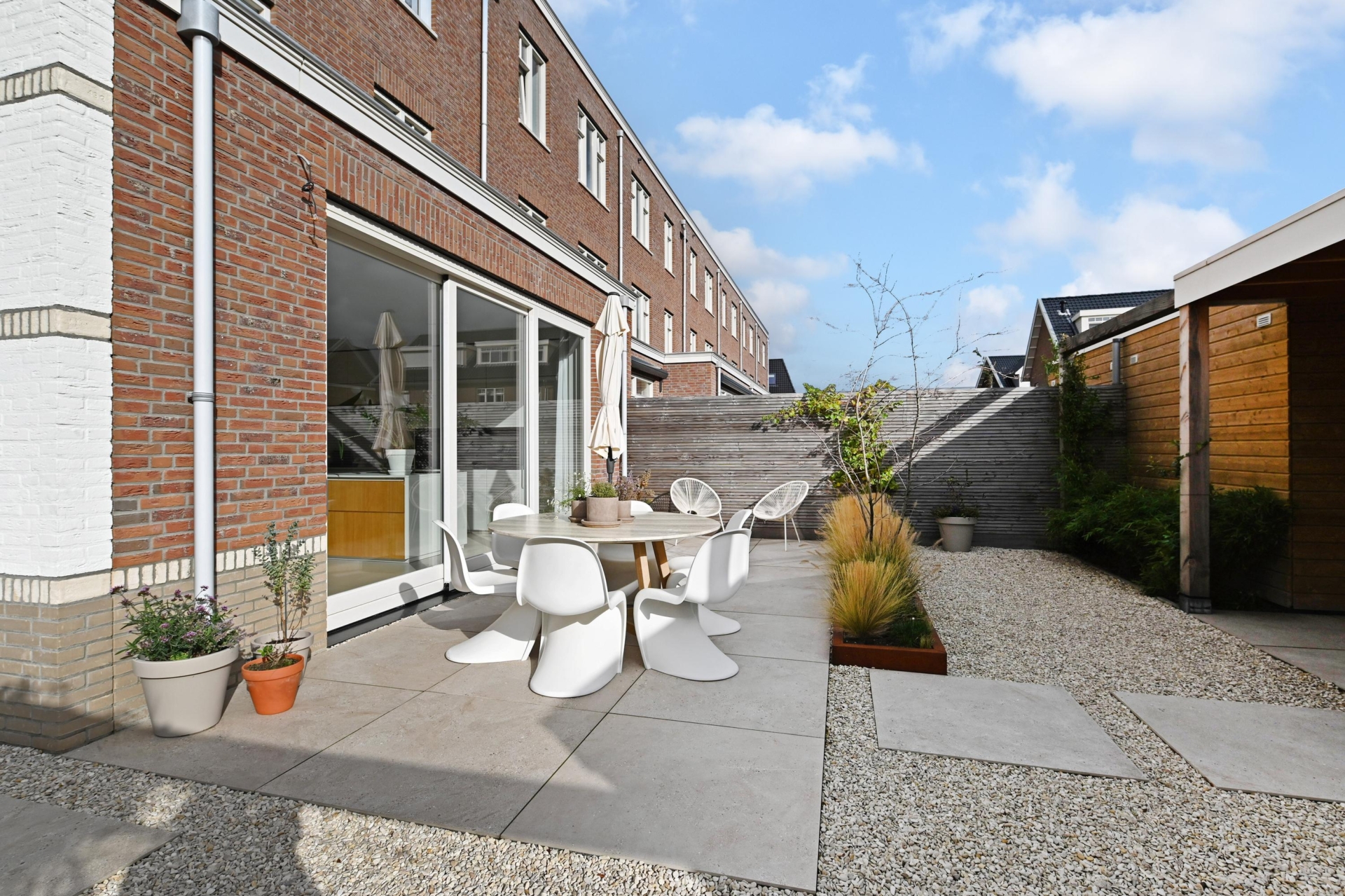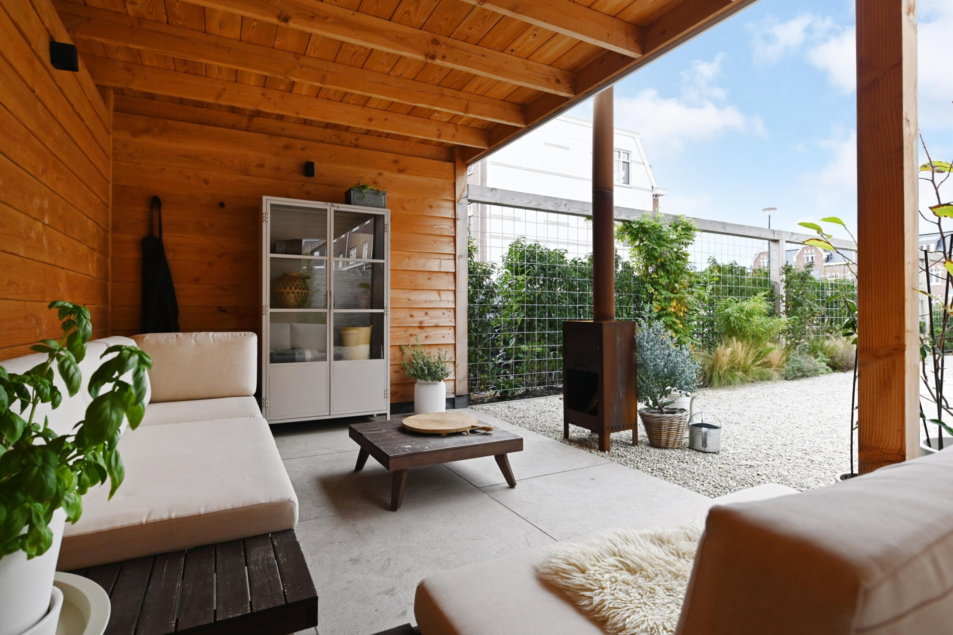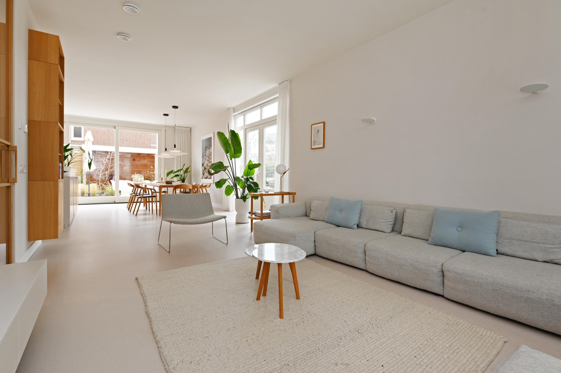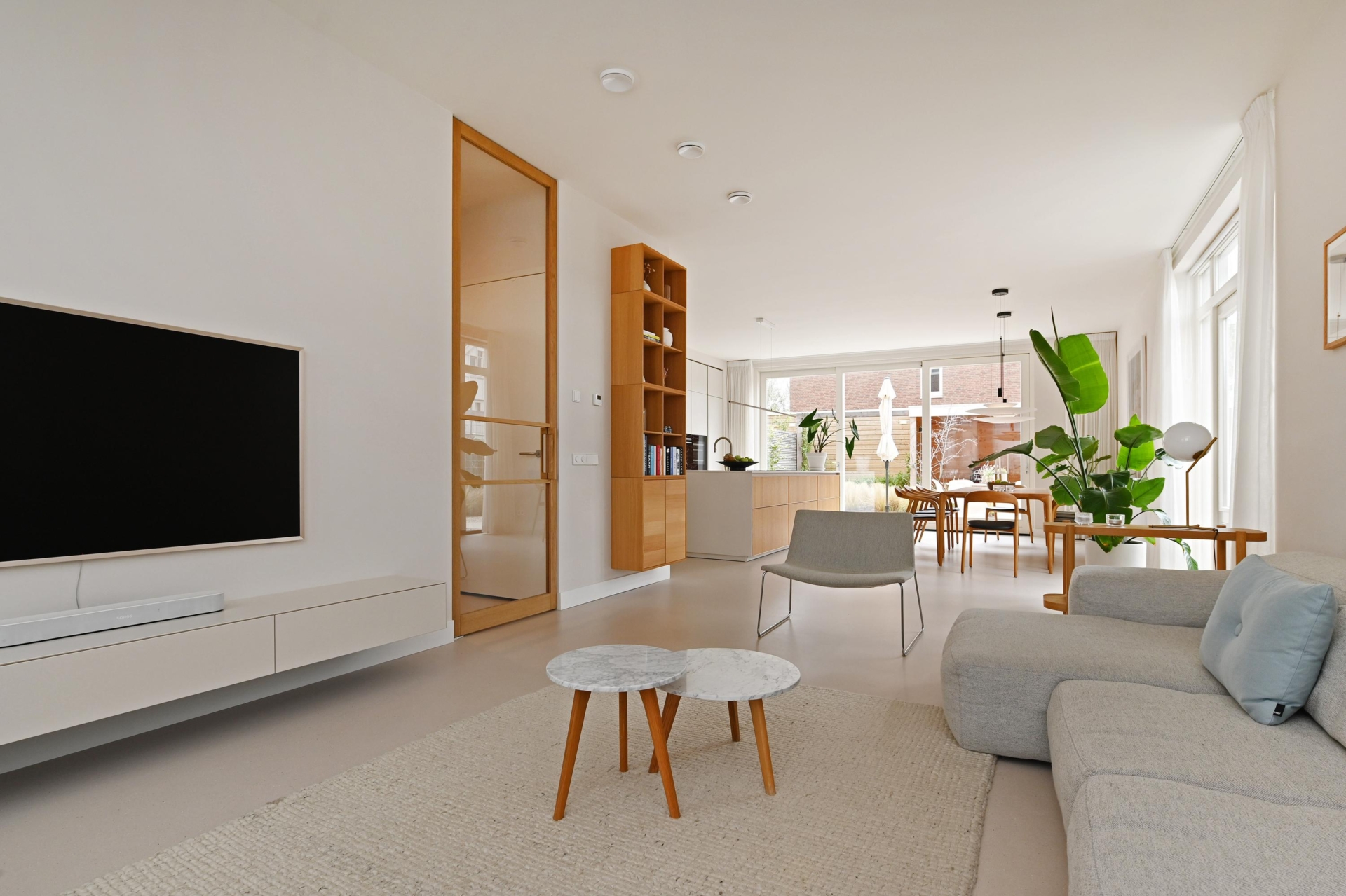 Via een prachtige eiken taatsdeur bereik je de woonkamer, waar direct het wauw-effect voelbaar is. De woonkamer is ruim en licht, met een open karakter en grote raampartijen die zorgen voor een overvloed aan daglicht. Door de openslaande deuren is de zonnige zijtuin op het westen bereikbaar en via dubbele schuifpuien stap je de brede, fraai aangelegde achtertuin op het zuiden in. De tuin is een heerlijke plek om te ontspannen, met een gezellige overkapping, een (fietsen)schuur voorzien van elektra, een buitenkraan en een doorgang naar de voorzijde via de zijtuin en de oprit.
