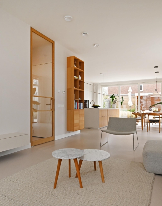 – Vloerverwarming en -koeling in de gehele woning, bij voordeur hangt ook een sensor voor die meet hoe warm het buiten is en dan gaat verwarmen of koelen;