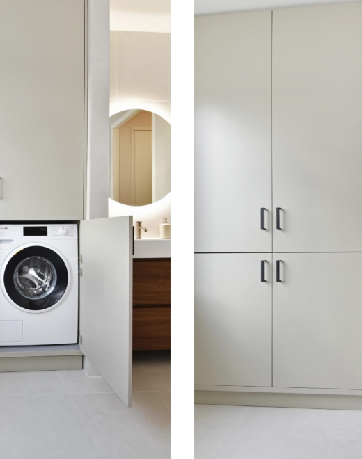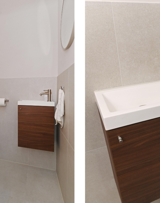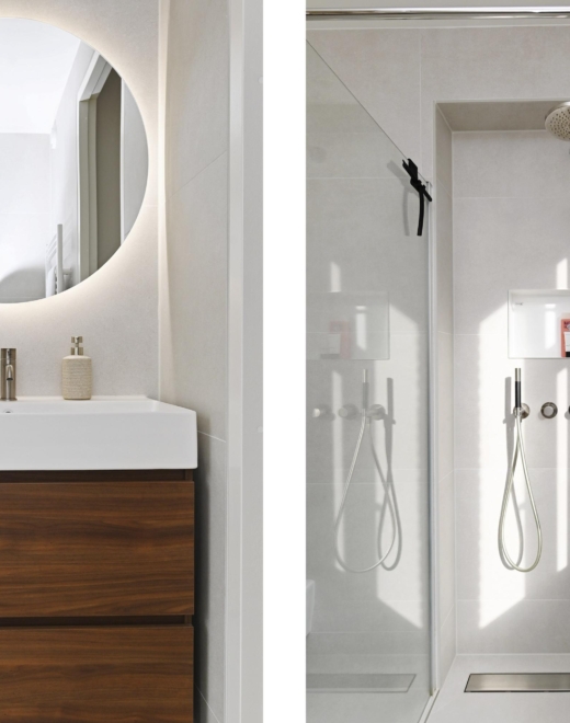 The second floor offers even more living comfort. On the landing you’ll find a storage area housing the inverter for the solar panels and the ventilation system. There’s also a second luxurious bathroom with walk-in shower, wash basin, toilet, radiator, and a stylish built-in cabinet with connections for a washer and dryer.