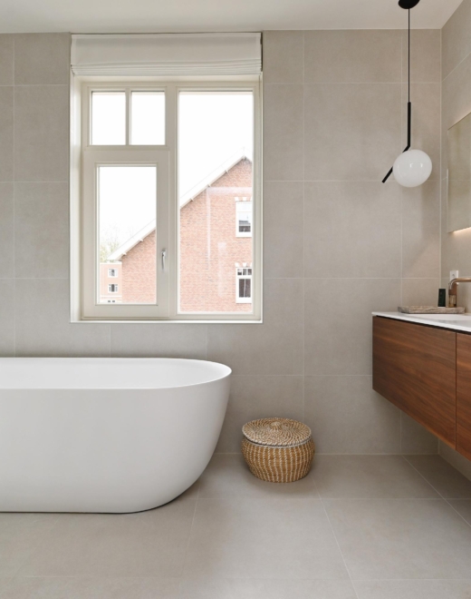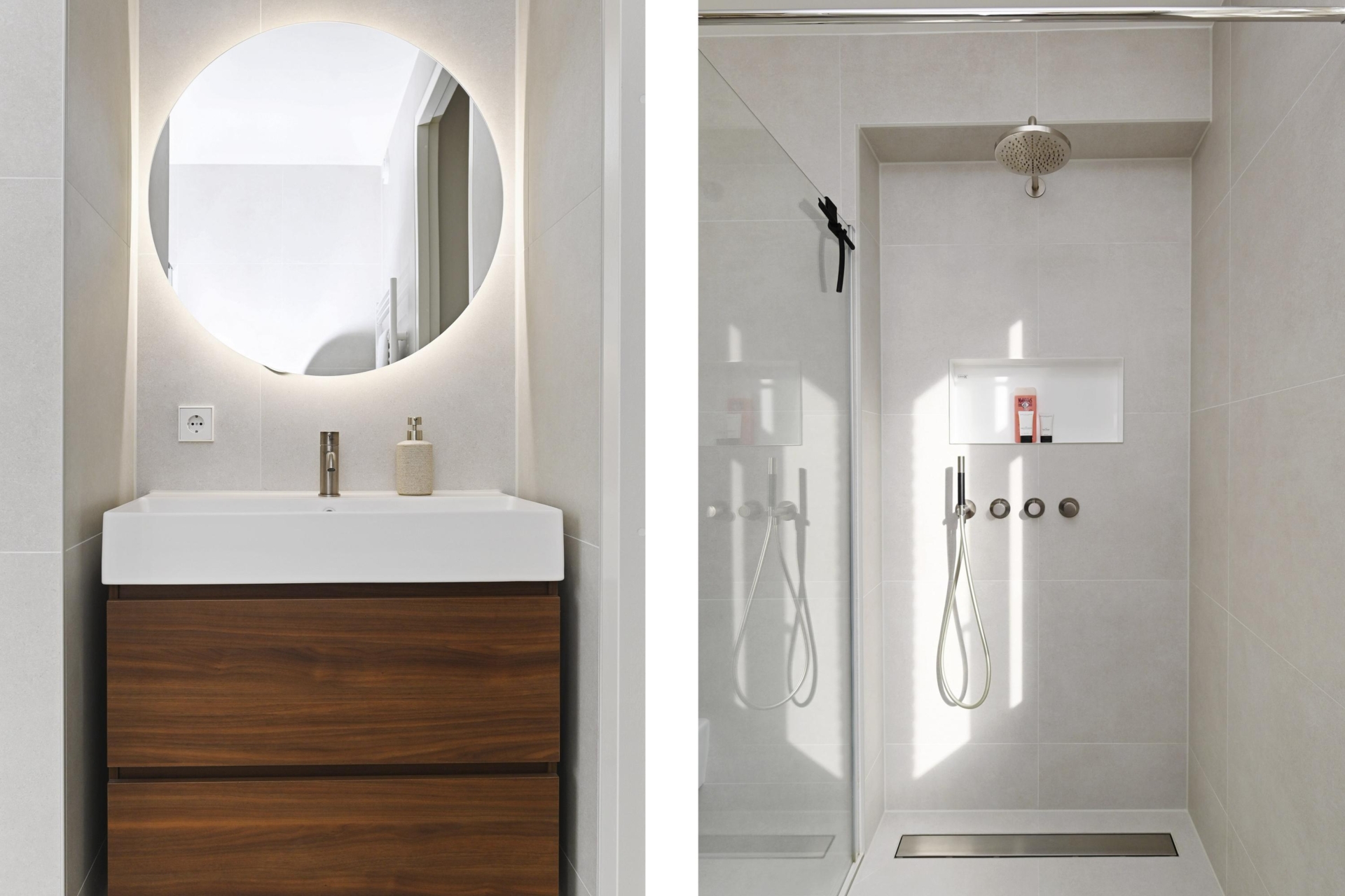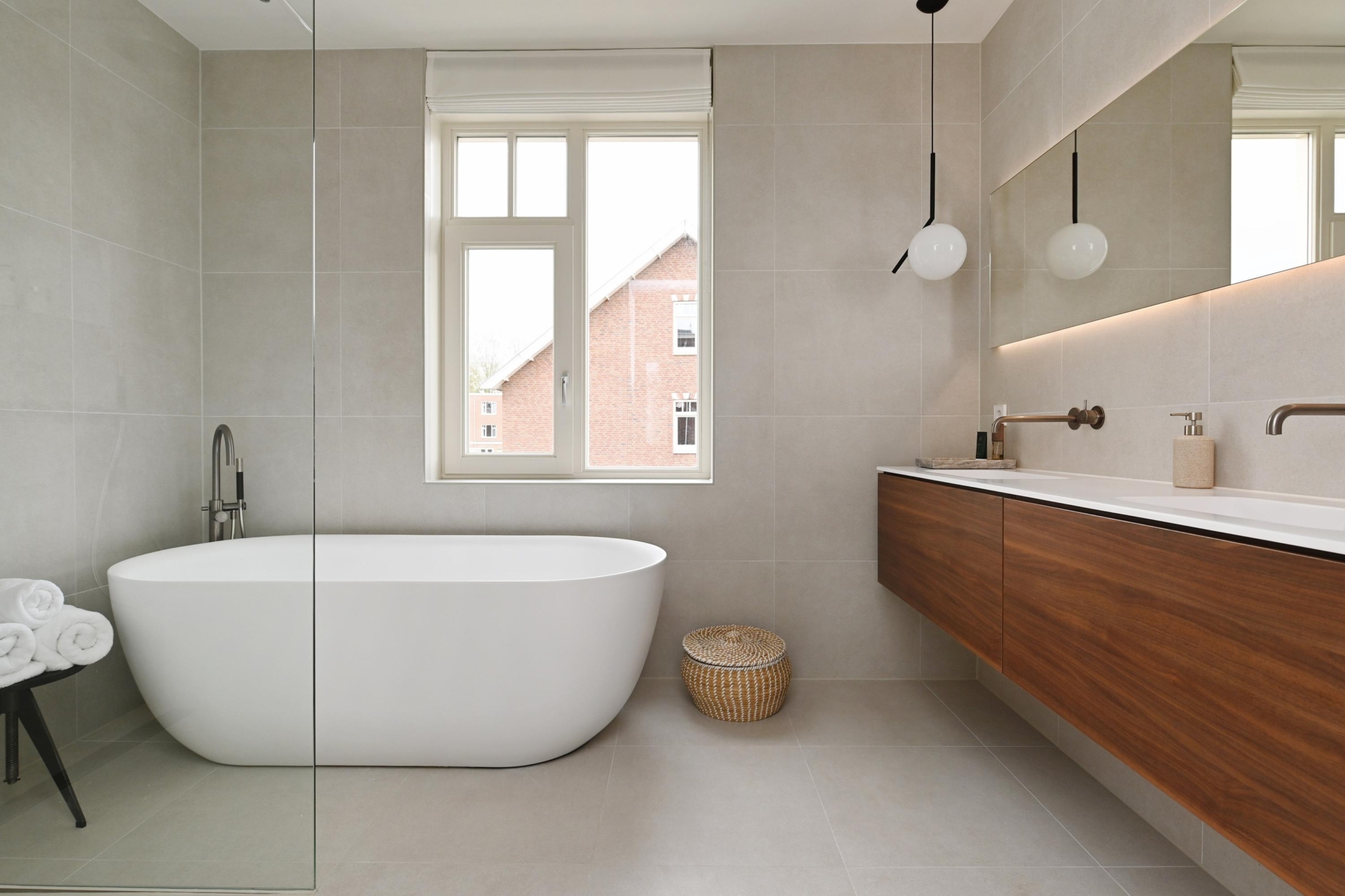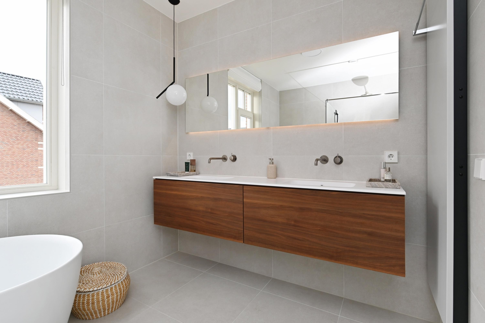- Badkamervoorzieningen Ligbad, douche, dubbele wastafel, wastafelmeubel, toilet, douche, wastafel, wasmachineaansluiting