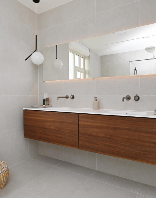 At the rear lies the large main bedroom, also fitted with custom-made wardrobes. The luxurious bathroom is a true retreat, boasting a freestanding bathtub, a spacious walk-in shower, a designer radiator, double wash basins and premium finishes throughout. A separate toilet with wash basin is also located on this floor.