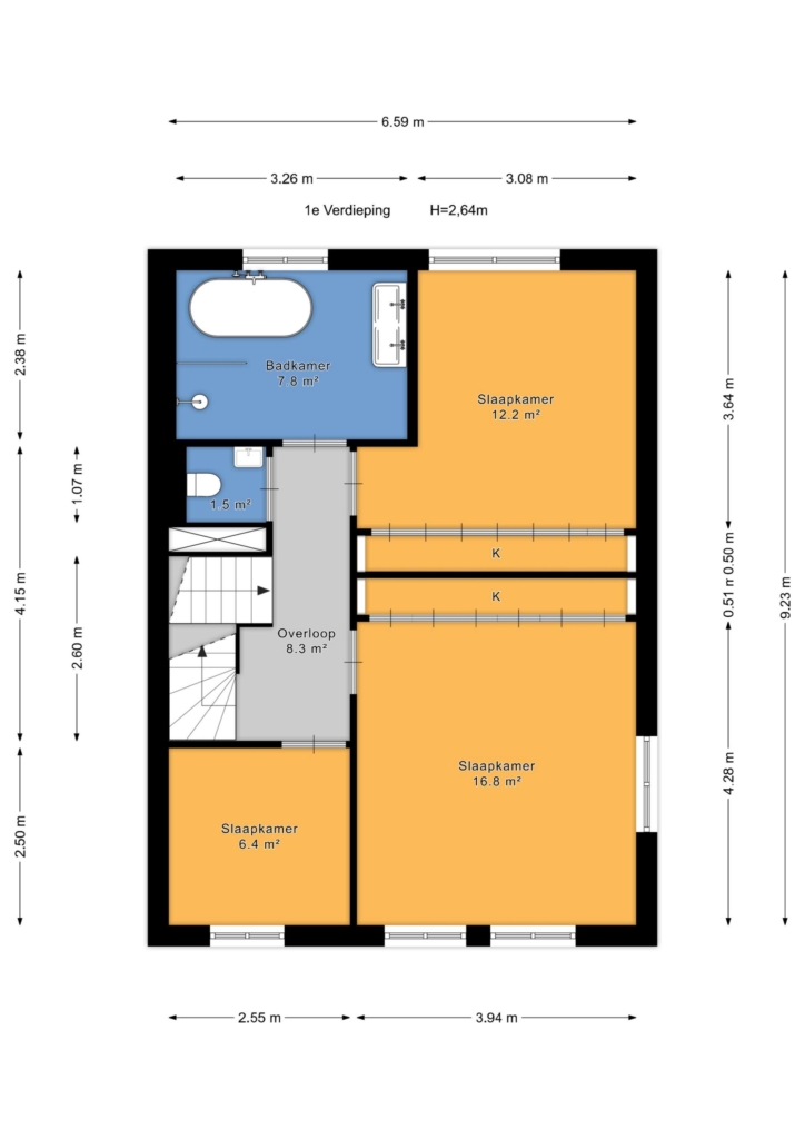 De 1e verdieping heeft een ruime overloop met toegang tot drie slaapkamers en een badkamer. Aan de voorzijde bevindt zich een lichte slaapkamer en op de hoek is een royale, zeer lichte kamer met prachtige inbouwkasten is gesitueerd.