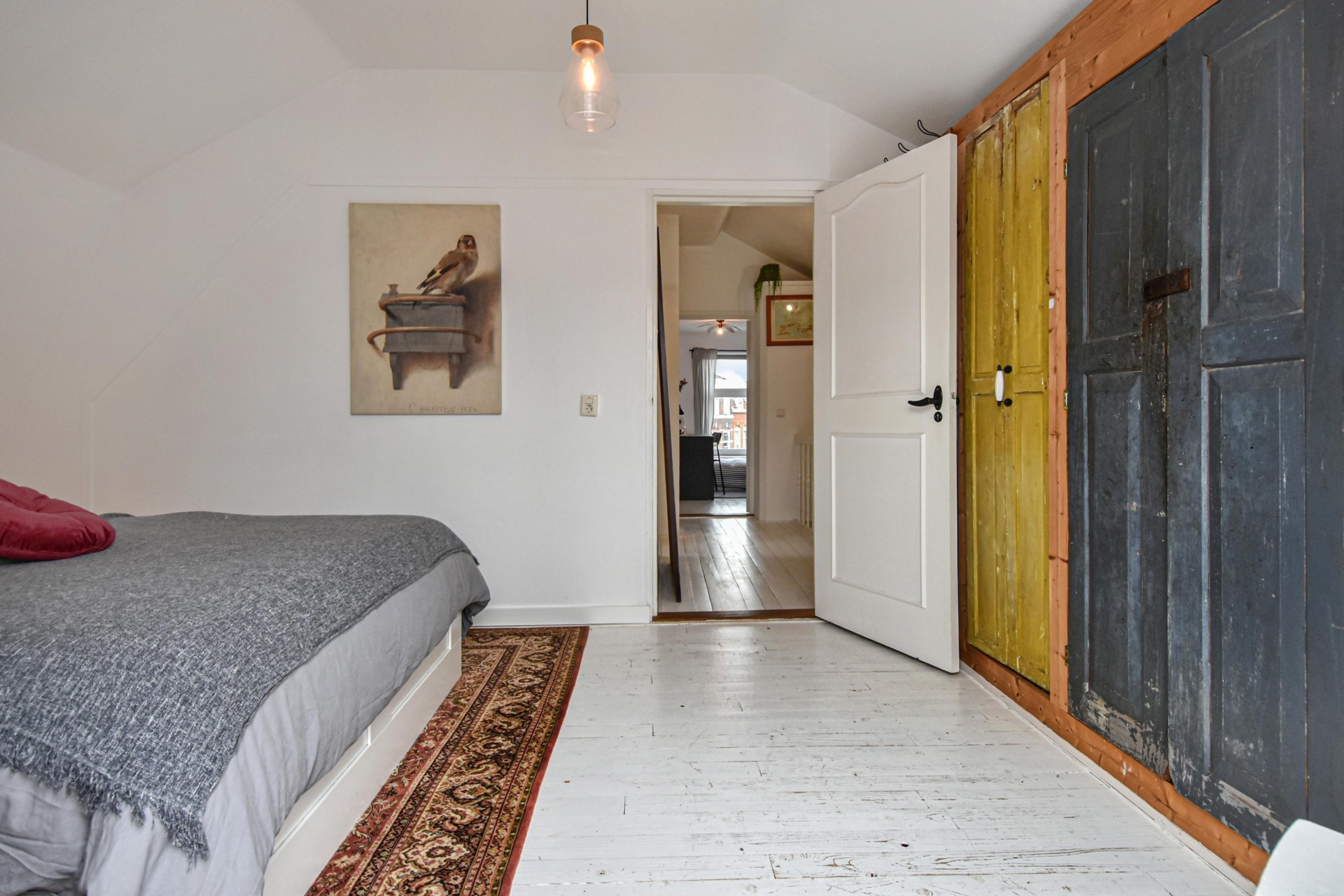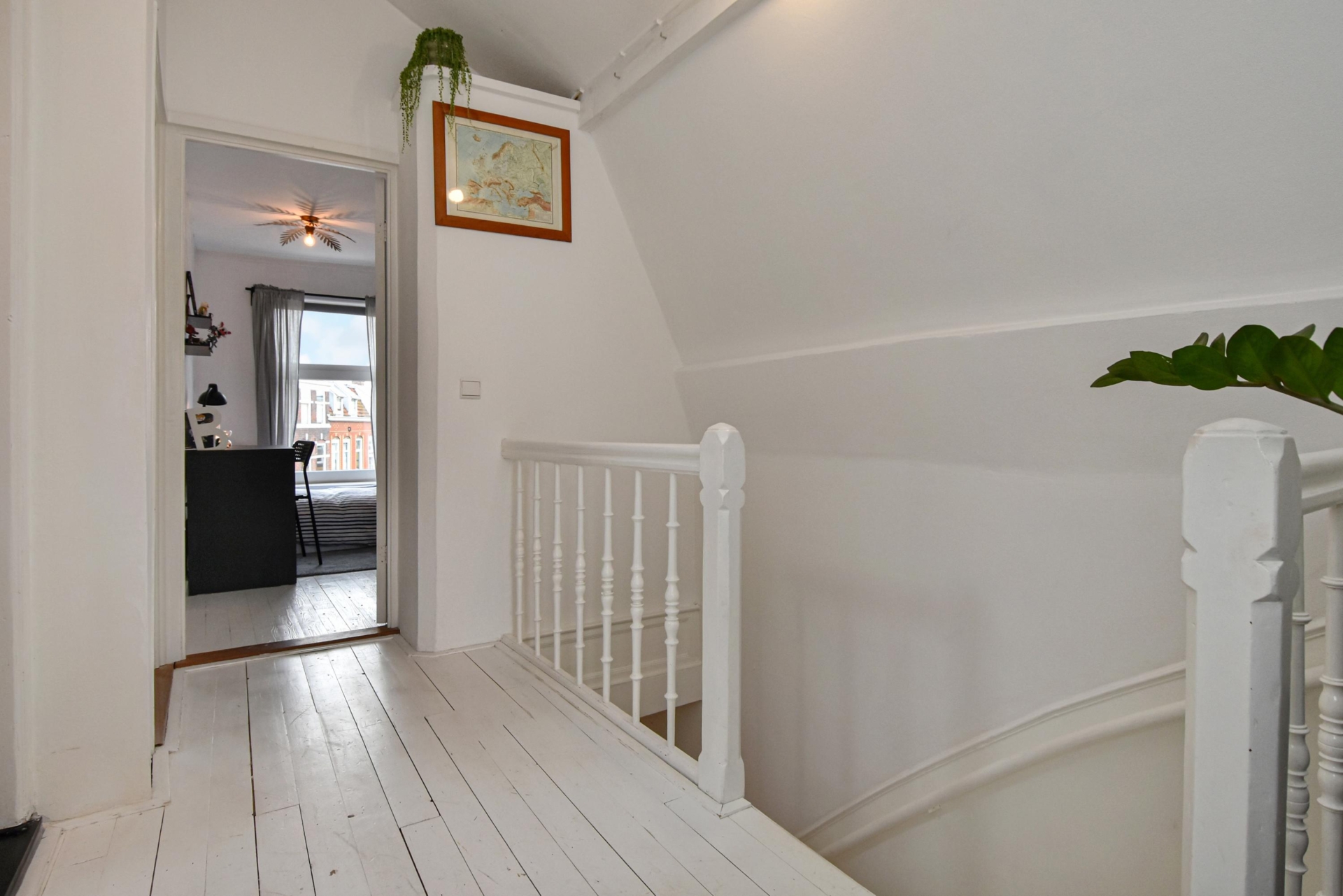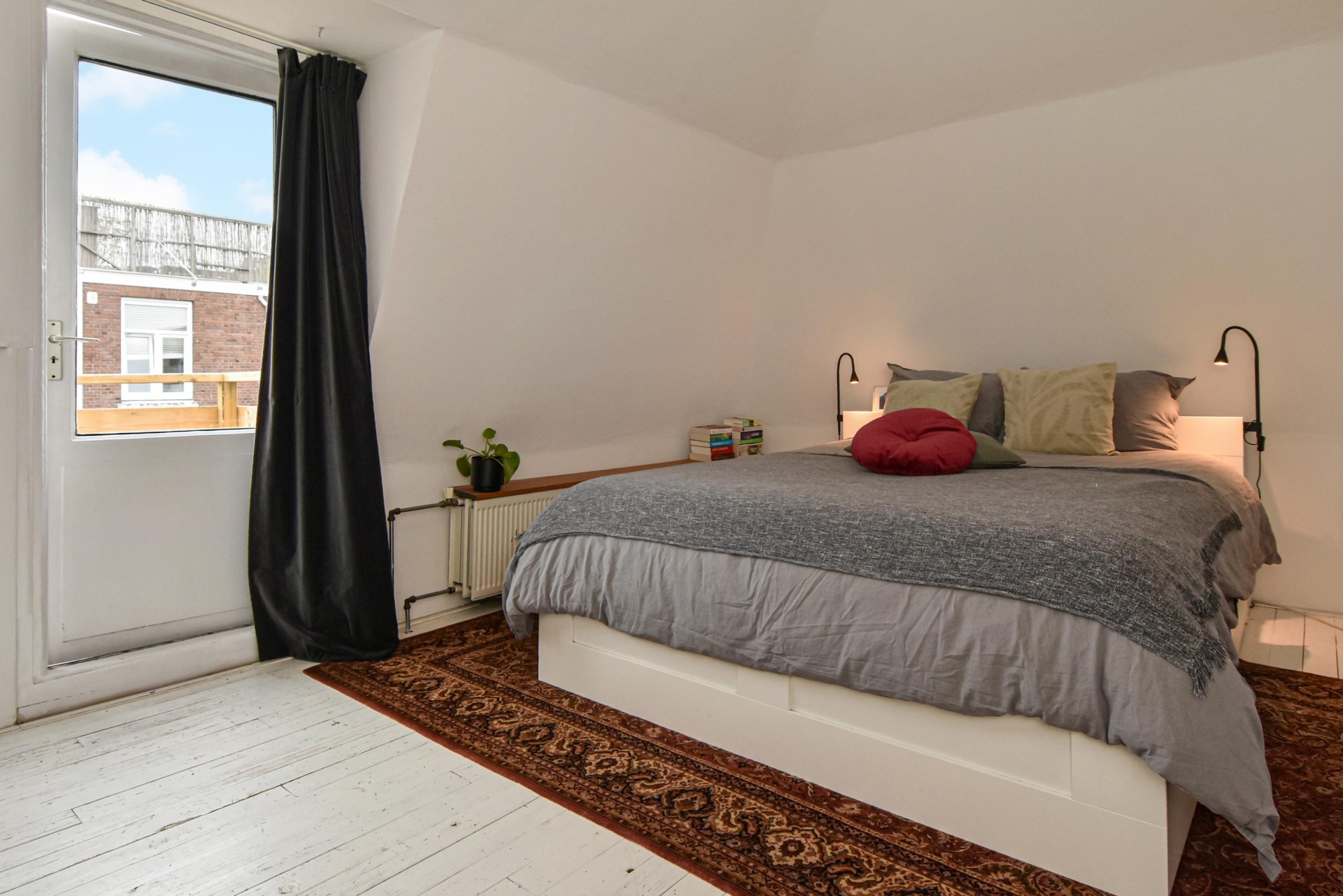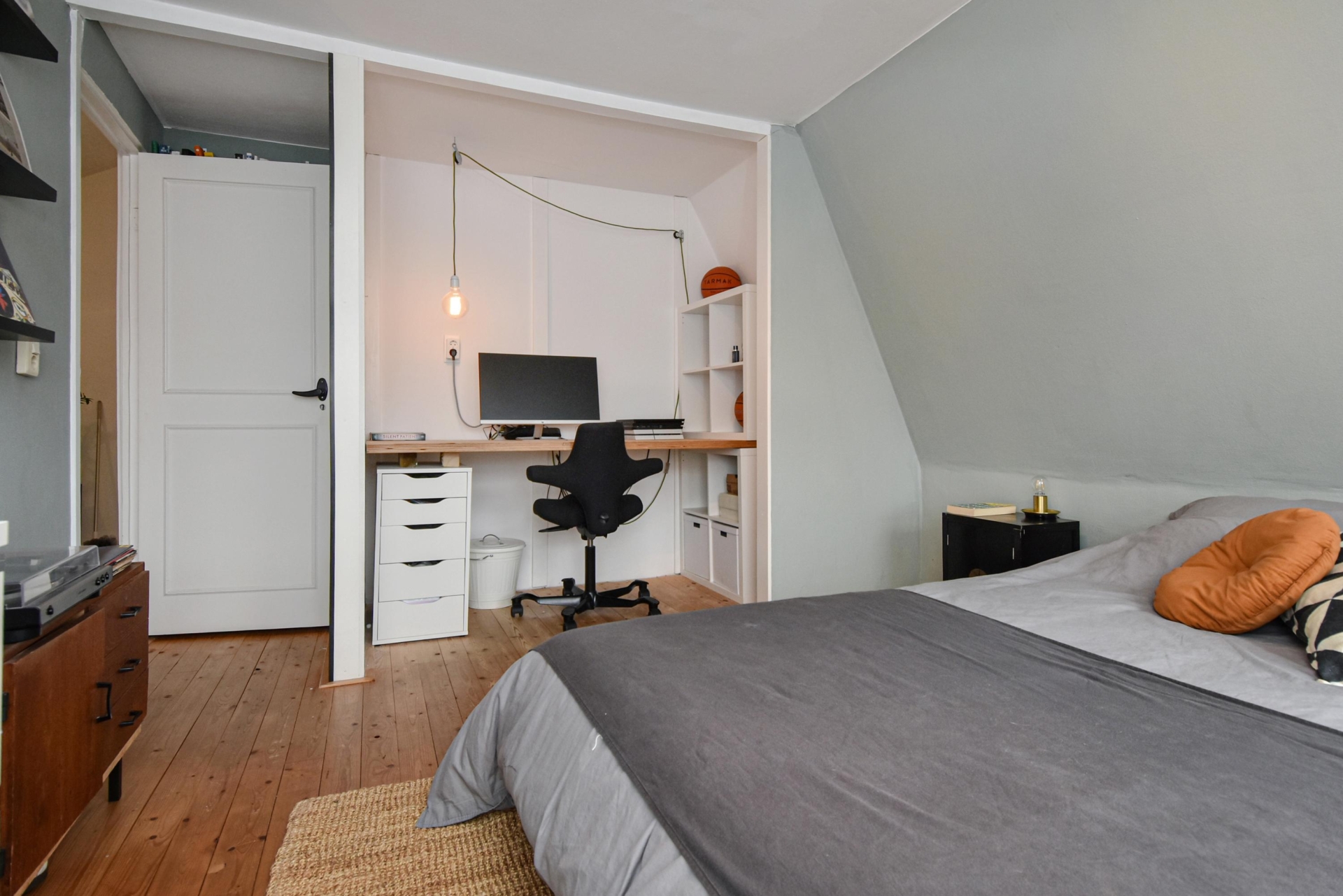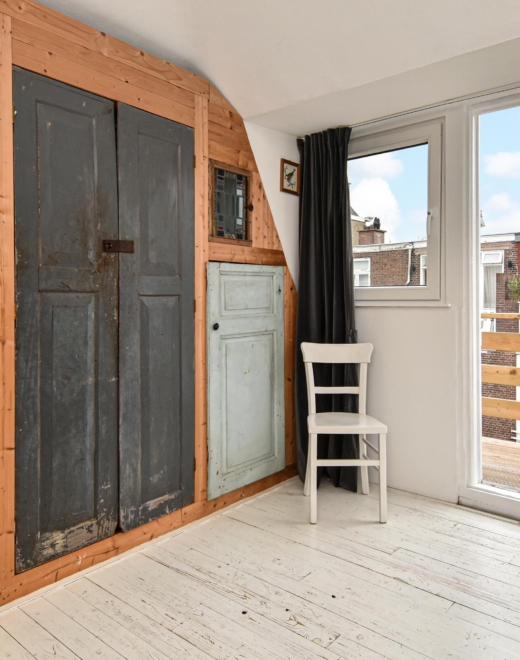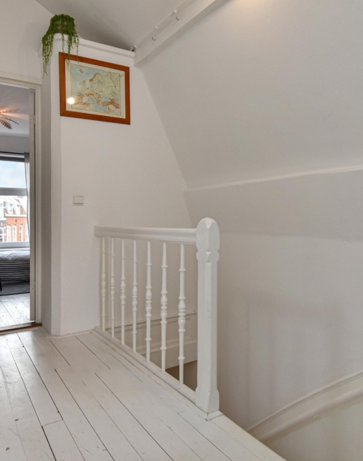 Een binnentrap leidt naar de 2e etage, waar opnieuw houten vloerdelen liggen, ditmaal wit gelakt. Op de overloop bevindt zich de cv-ketel. Aan de voorzijde ligt een ruime slaapkamer met veel lichtinval en een charmant uitzicht de straat in. Daarnaast is er nog een zijkamer met vaste kast.