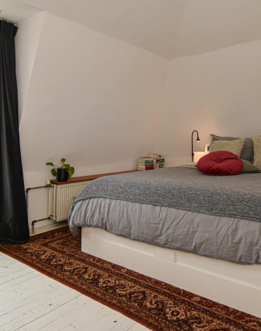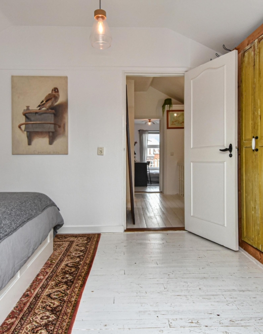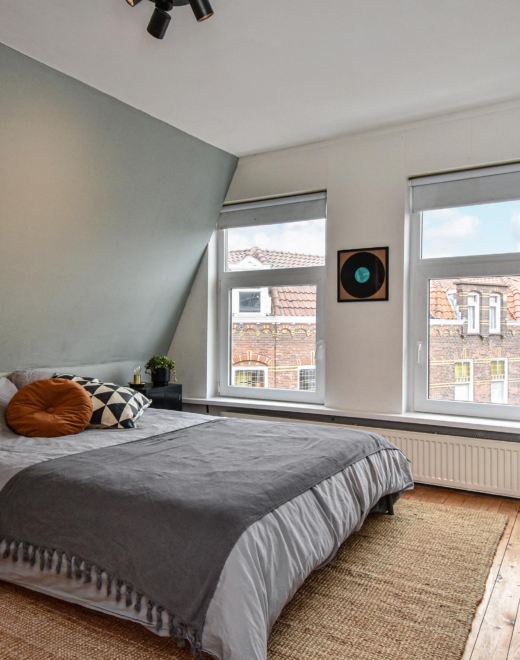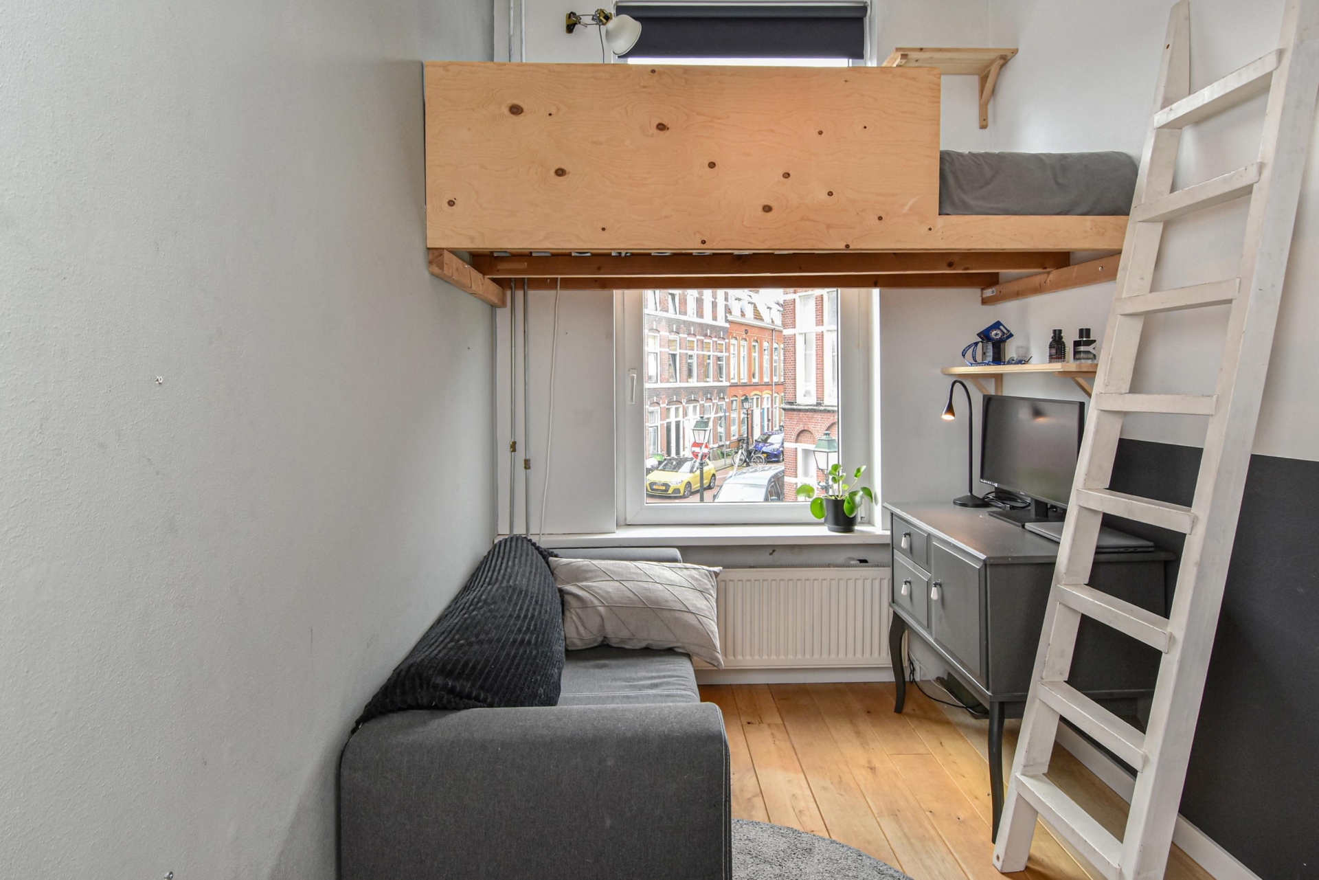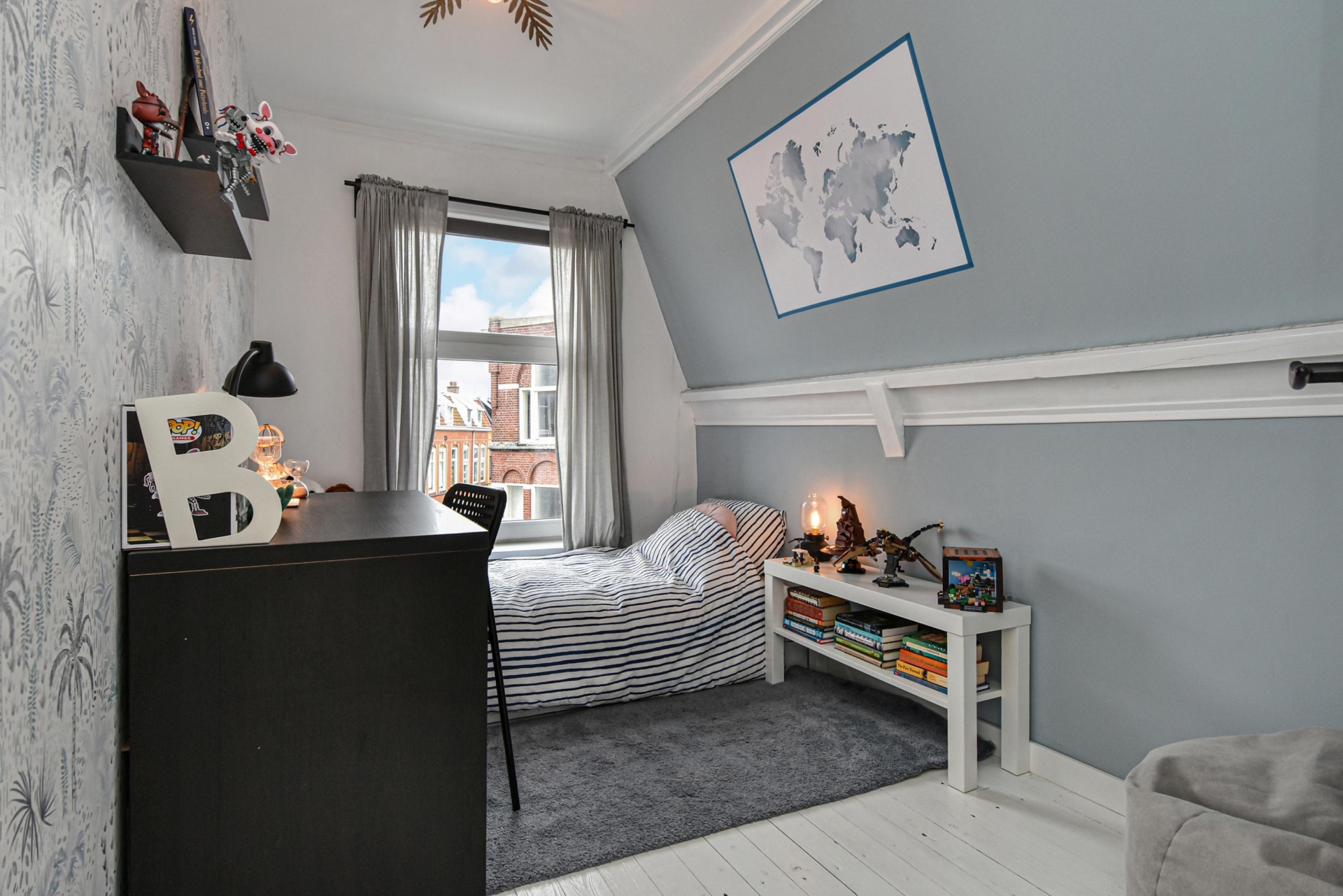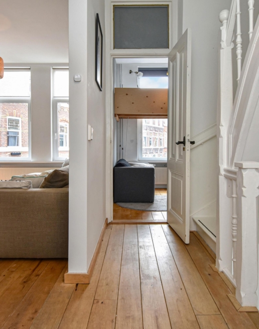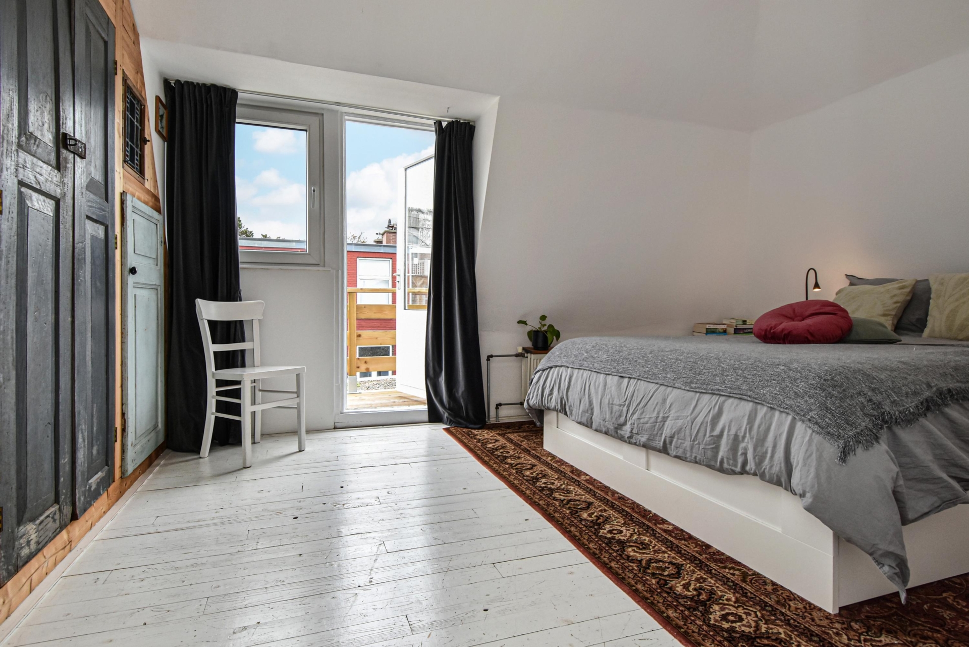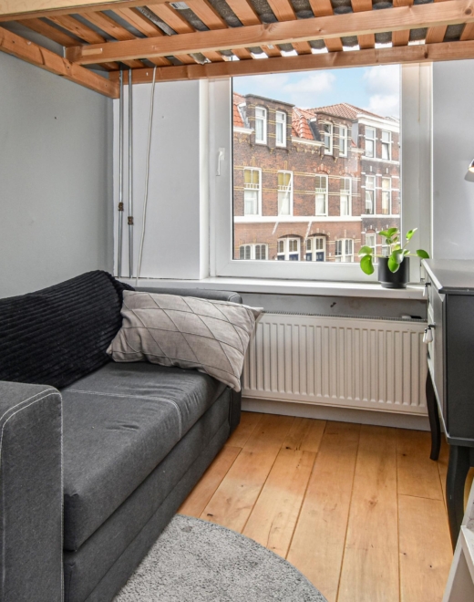 Een binnentrap leidt naar de 2e etage, waar opnieuw houten vloerdelen liggen, ditmaal wit gelakt. Op de overloop bevindt zich de cv-ketel. Aan de voorzijde ligt een ruime slaapkamer met veel lichtinval en een charmant uitzicht de straat in. Daarnaast is er nog een zijkamer met vaste kast.