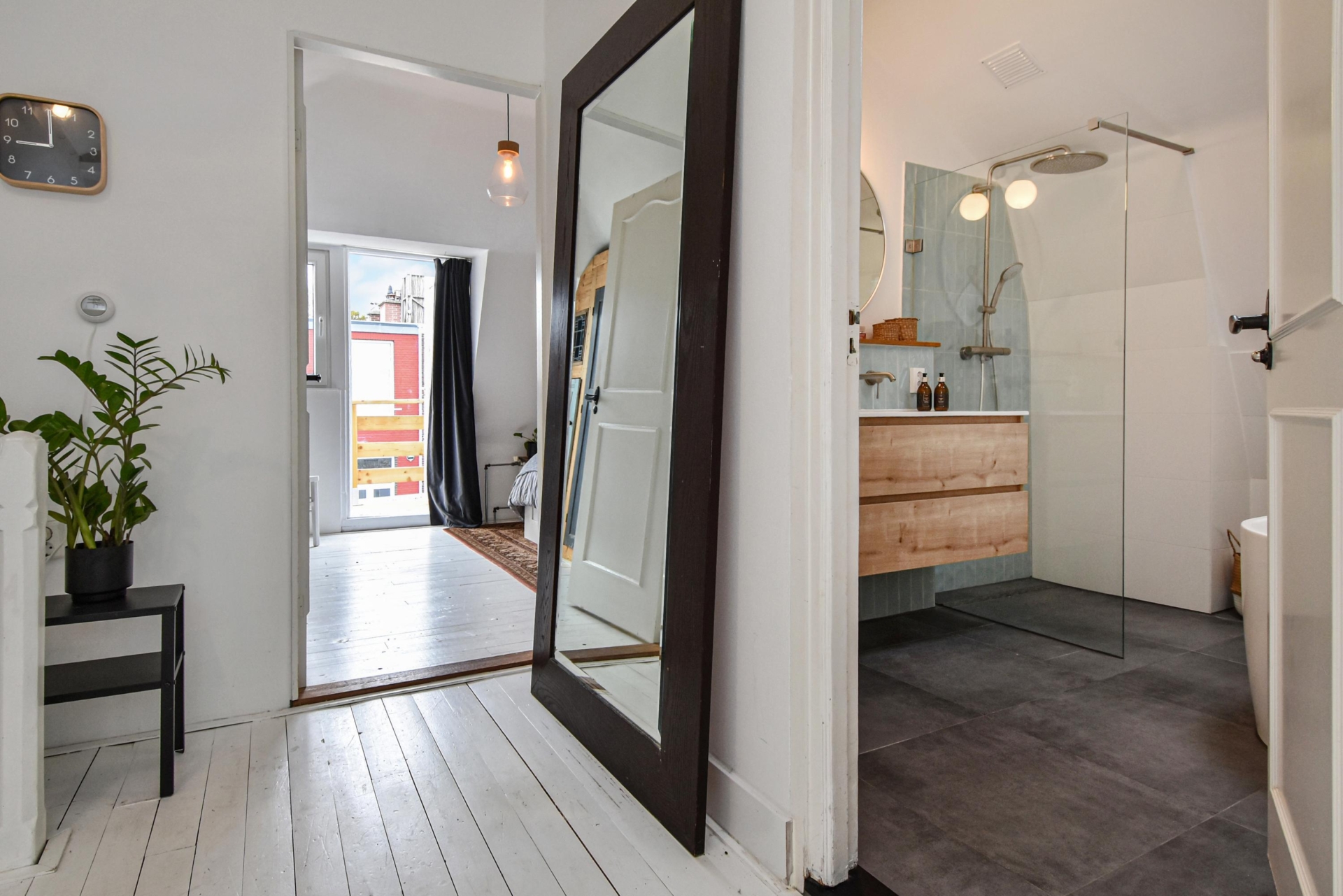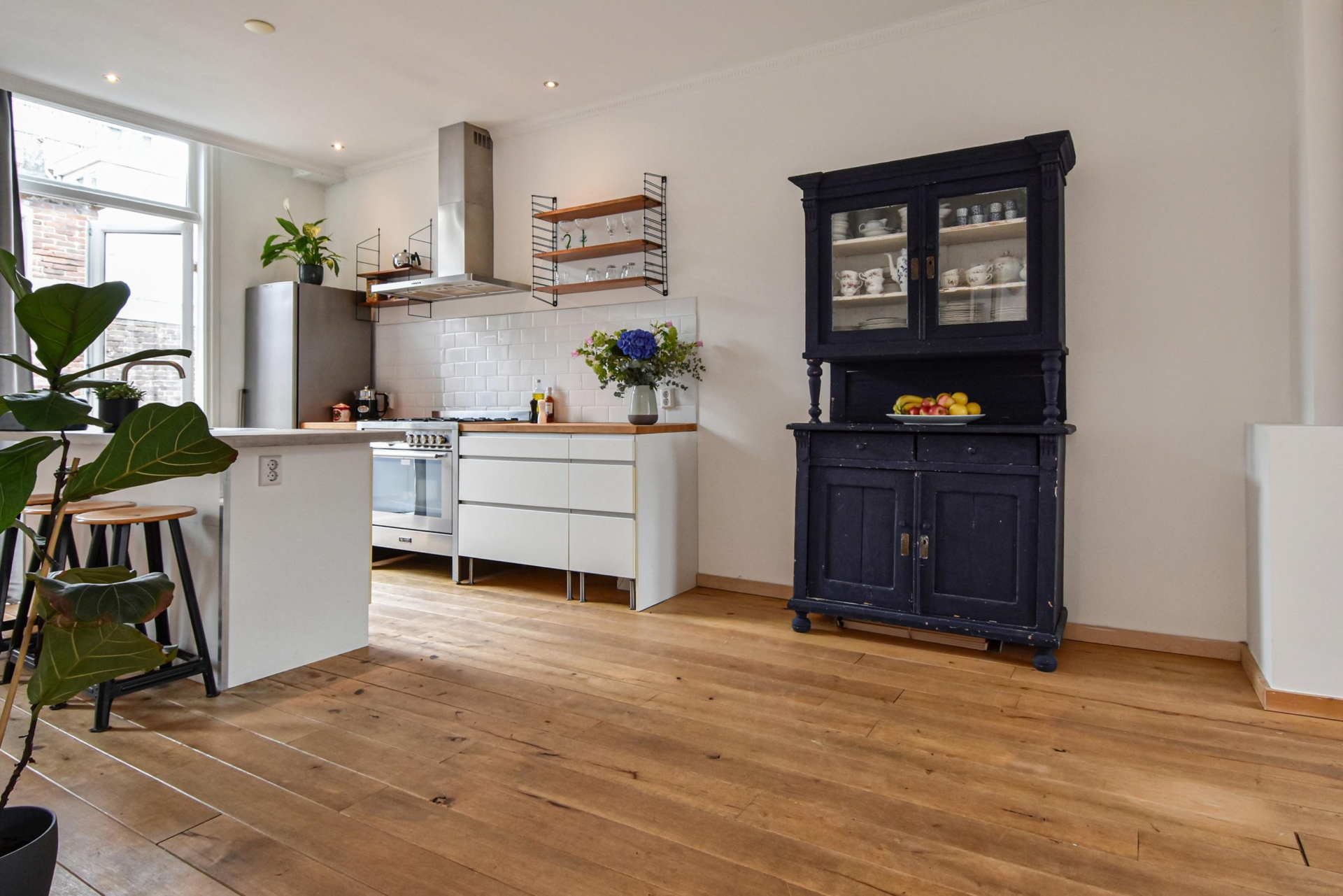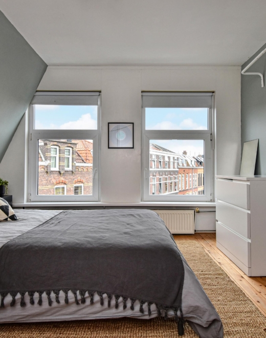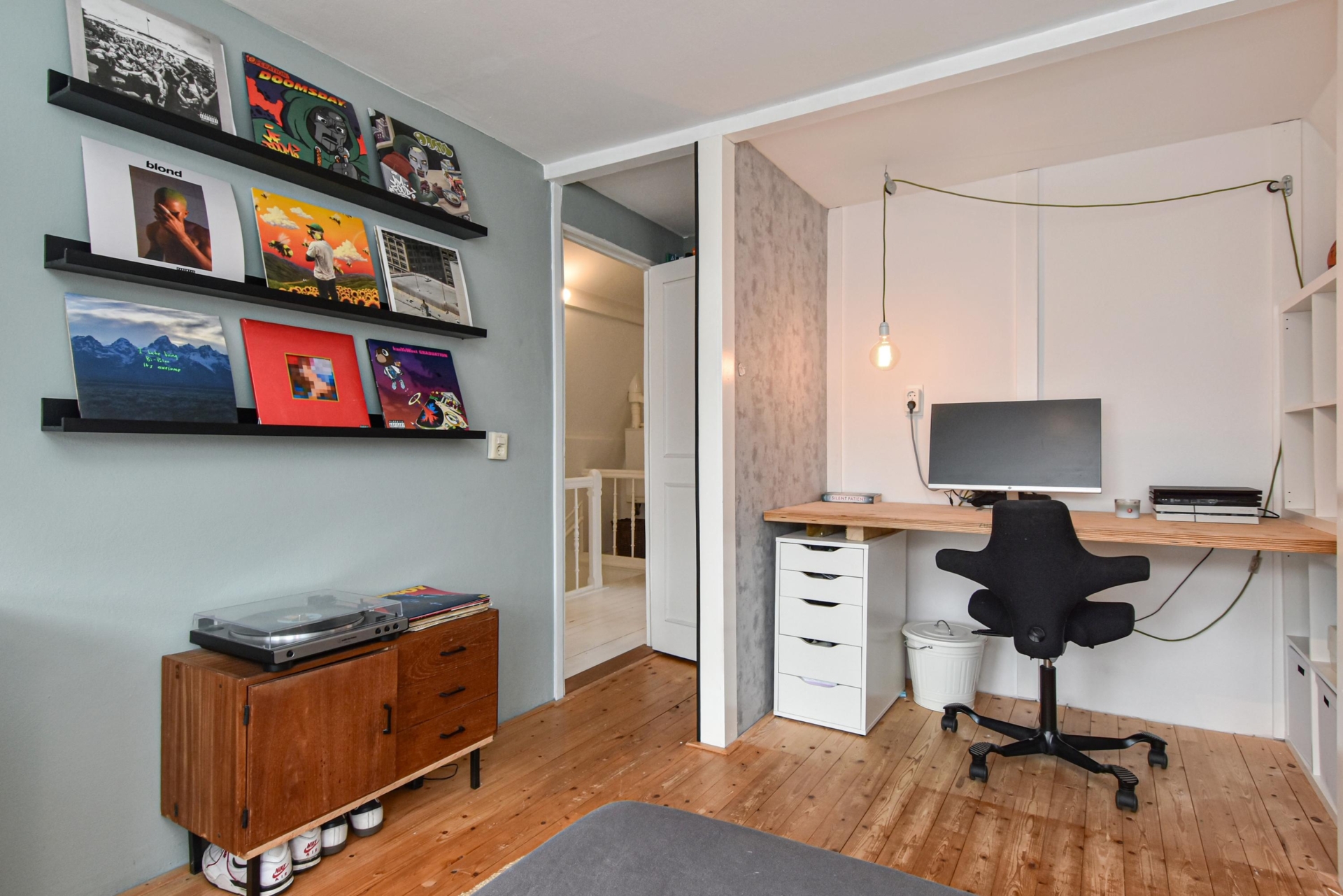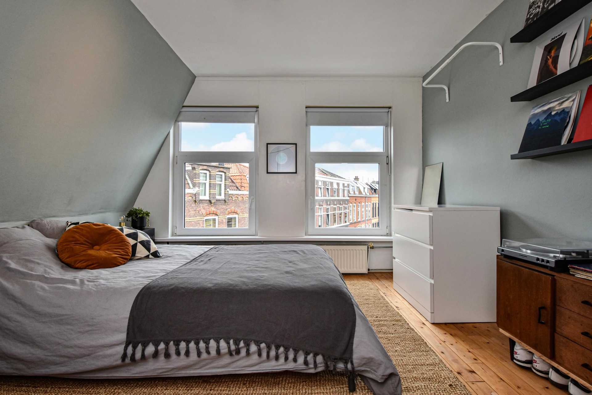 Een binnentrap leidt naar de 2e etage, waar opnieuw houten vloerdelen liggen, ditmaal wit gelakt. Op de overloop bevindt zich de cv-ketel. Aan de voorzijde ligt een ruime slaapkamer met veel lichtinval en een charmant uitzicht de straat in. Daarnaast is er nog een zijkamer met vaste kast.