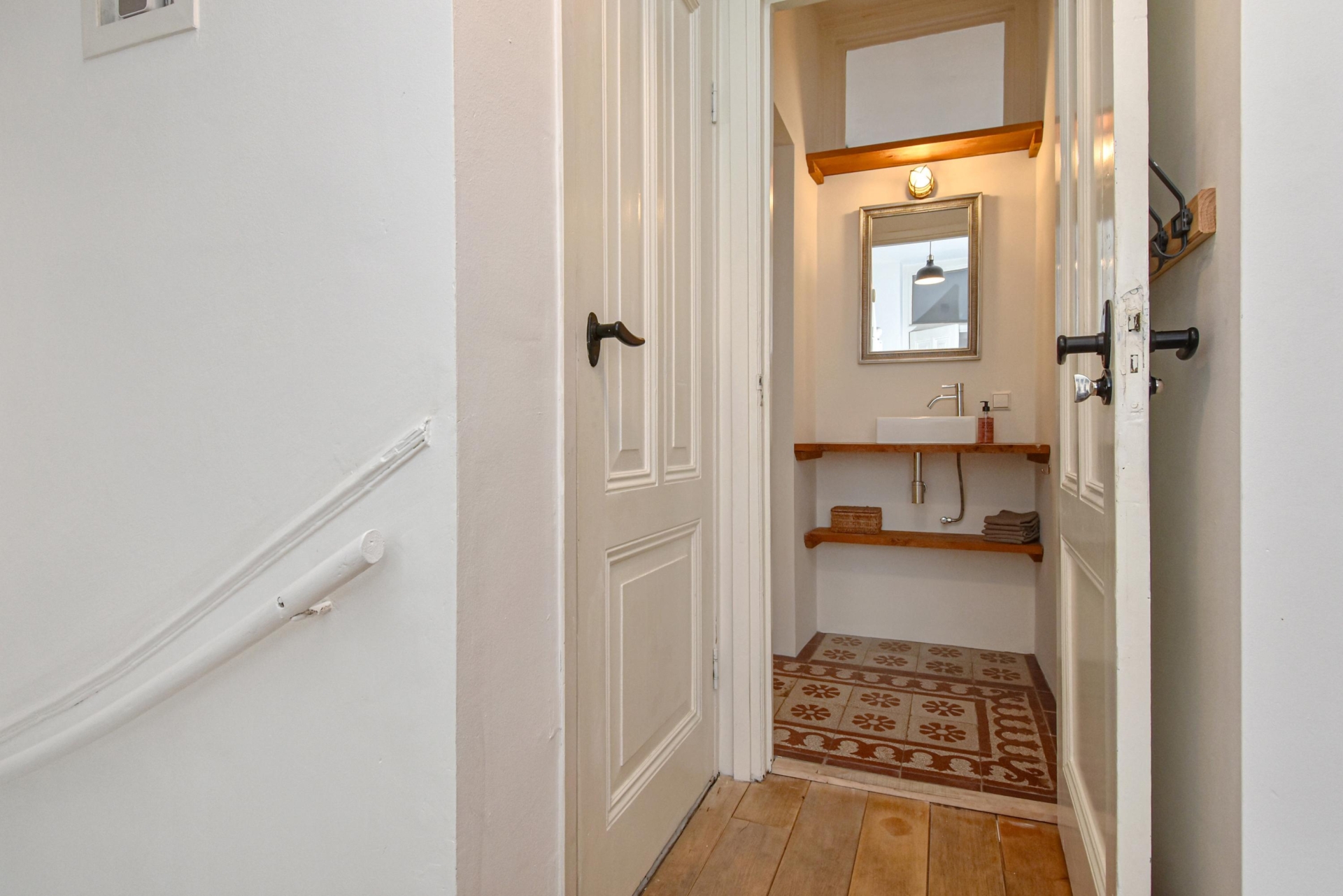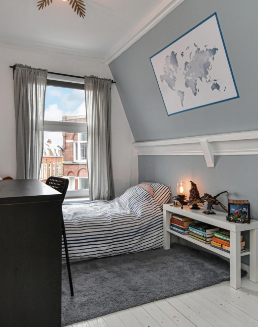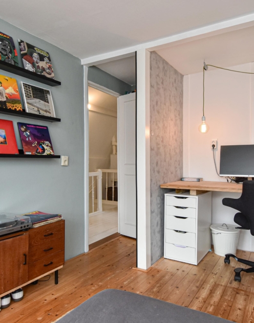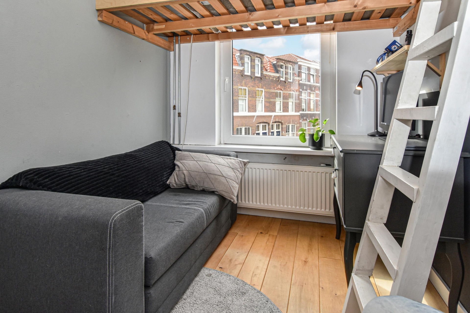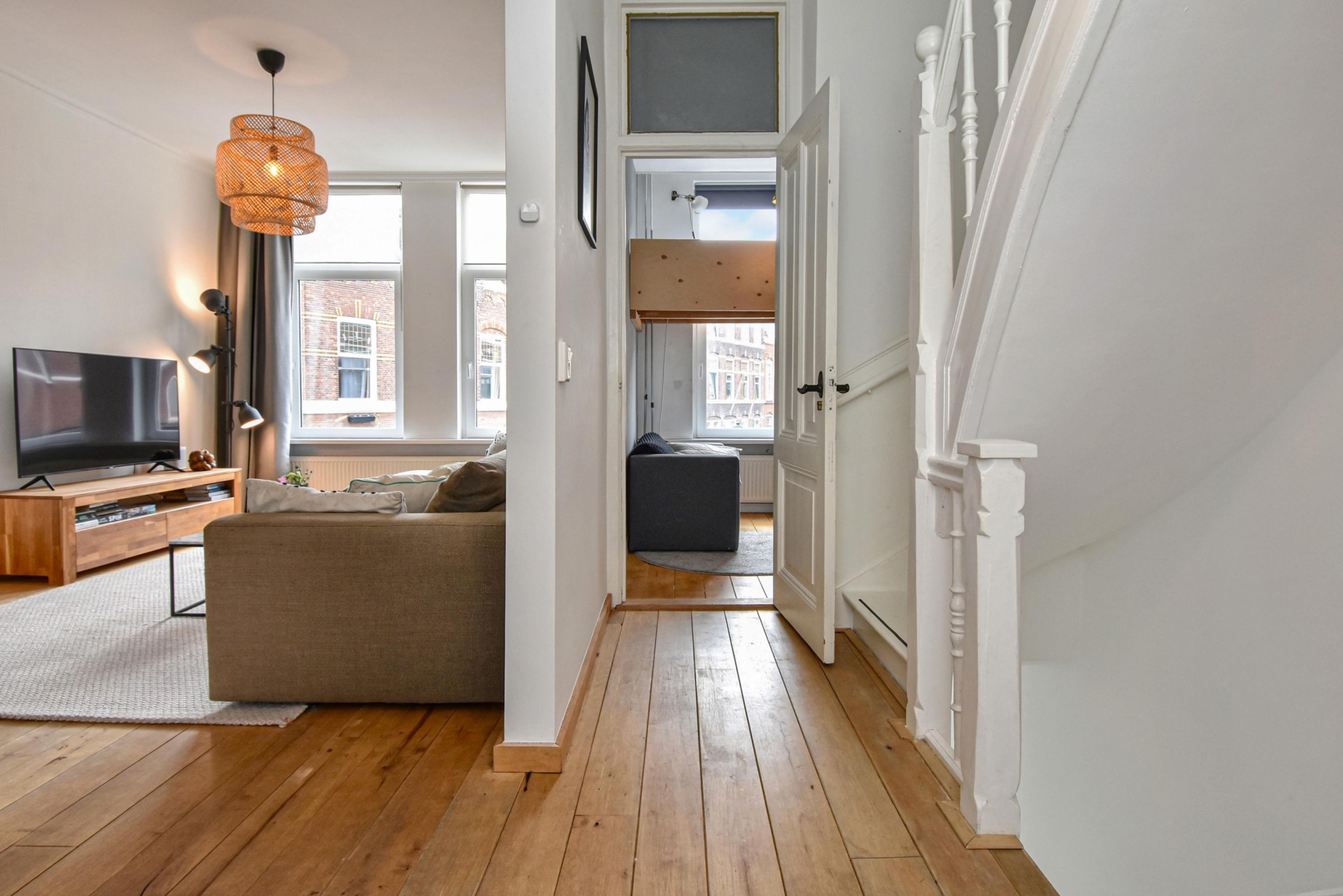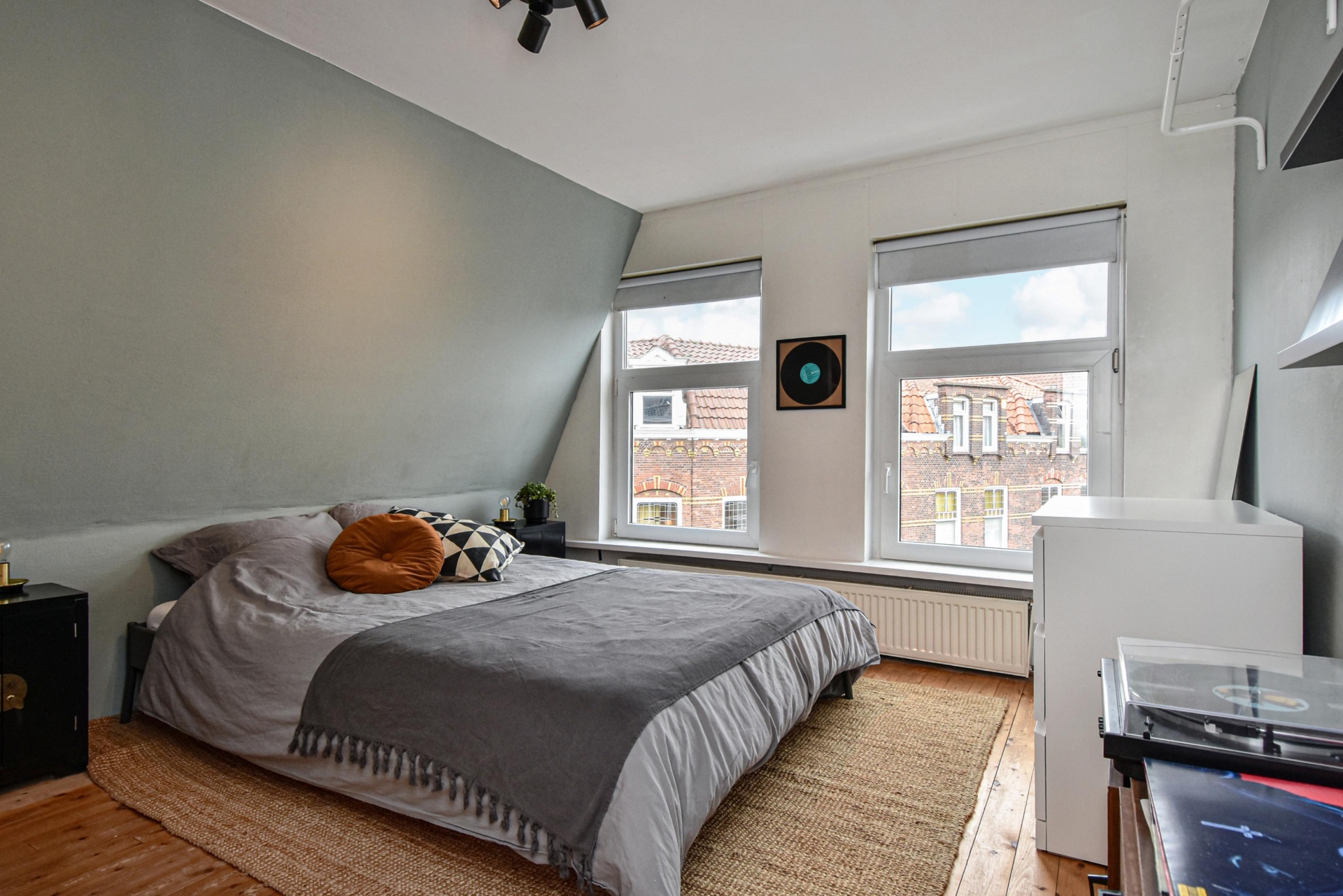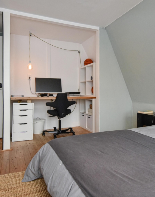 Een binnentrap leidt naar de 2e etage, waar opnieuw houten vloerdelen liggen, ditmaal wit gelakt. Op de overloop bevindt zich de cv-ketel. Aan de voorzijde ligt een ruime slaapkamer met veel lichtinval en een charmant uitzicht de straat in. Daarnaast is er nog een zijkamer met vaste kast.