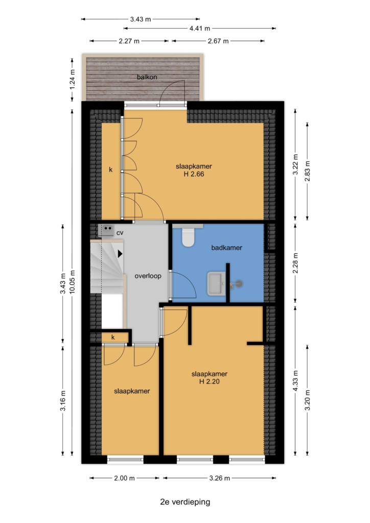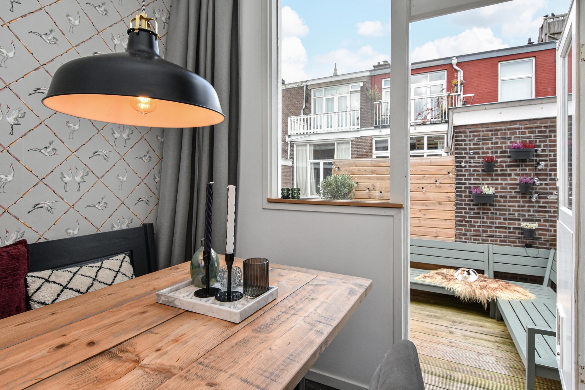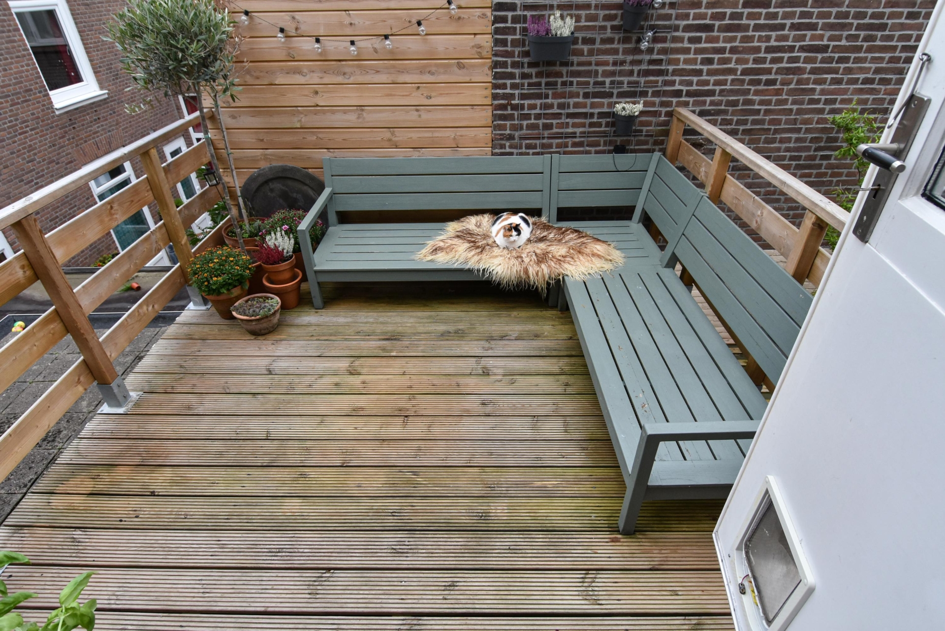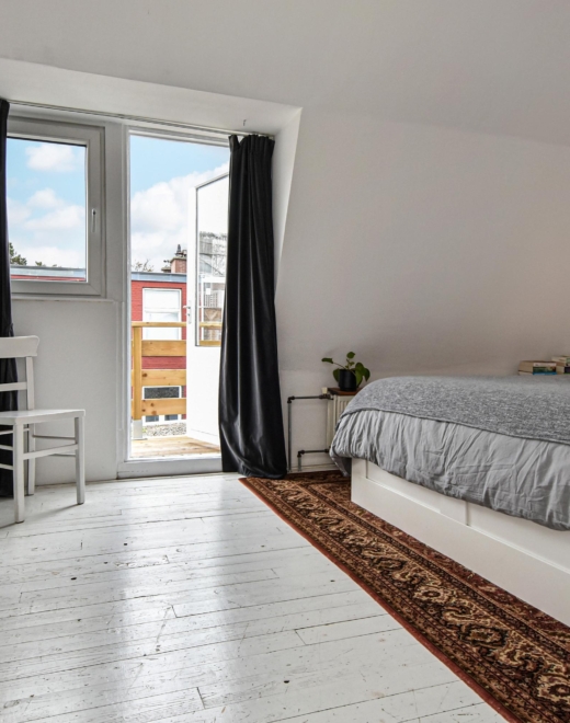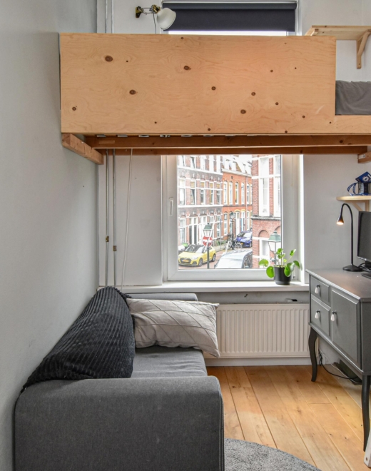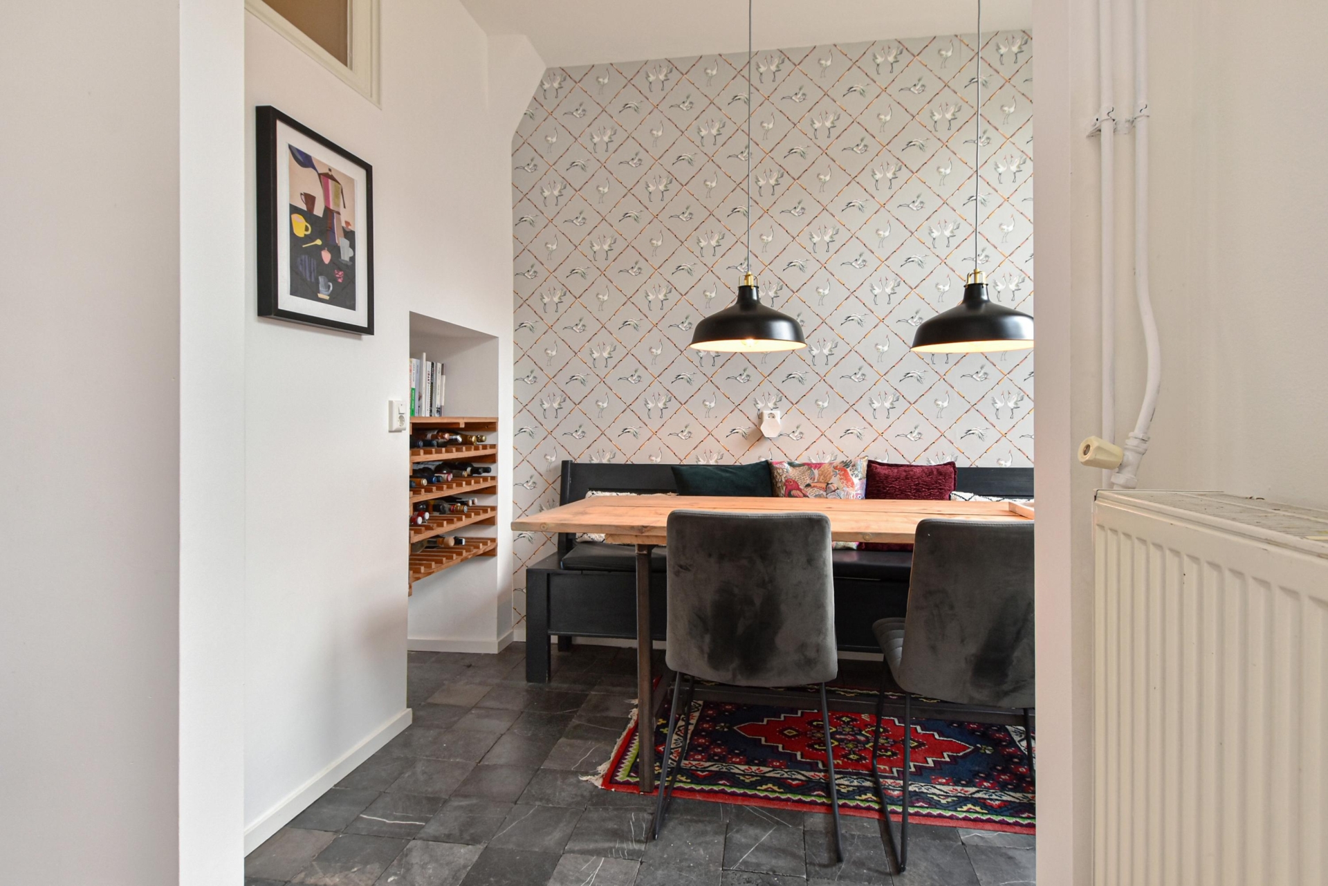 Een binnentrap leidt naar de 2e etage, waar opnieuw houten vloerdelen liggen, ditmaal wit gelakt. Op de overloop bevindt zich de cv-ketel. Aan de voorzijde ligt een ruime slaapkamer met veel lichtinval en een charmant uitzicht de straat in. Daarnaast is er nog een zijkamer met vaste kast.