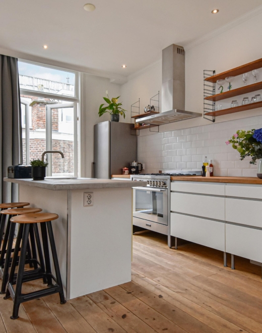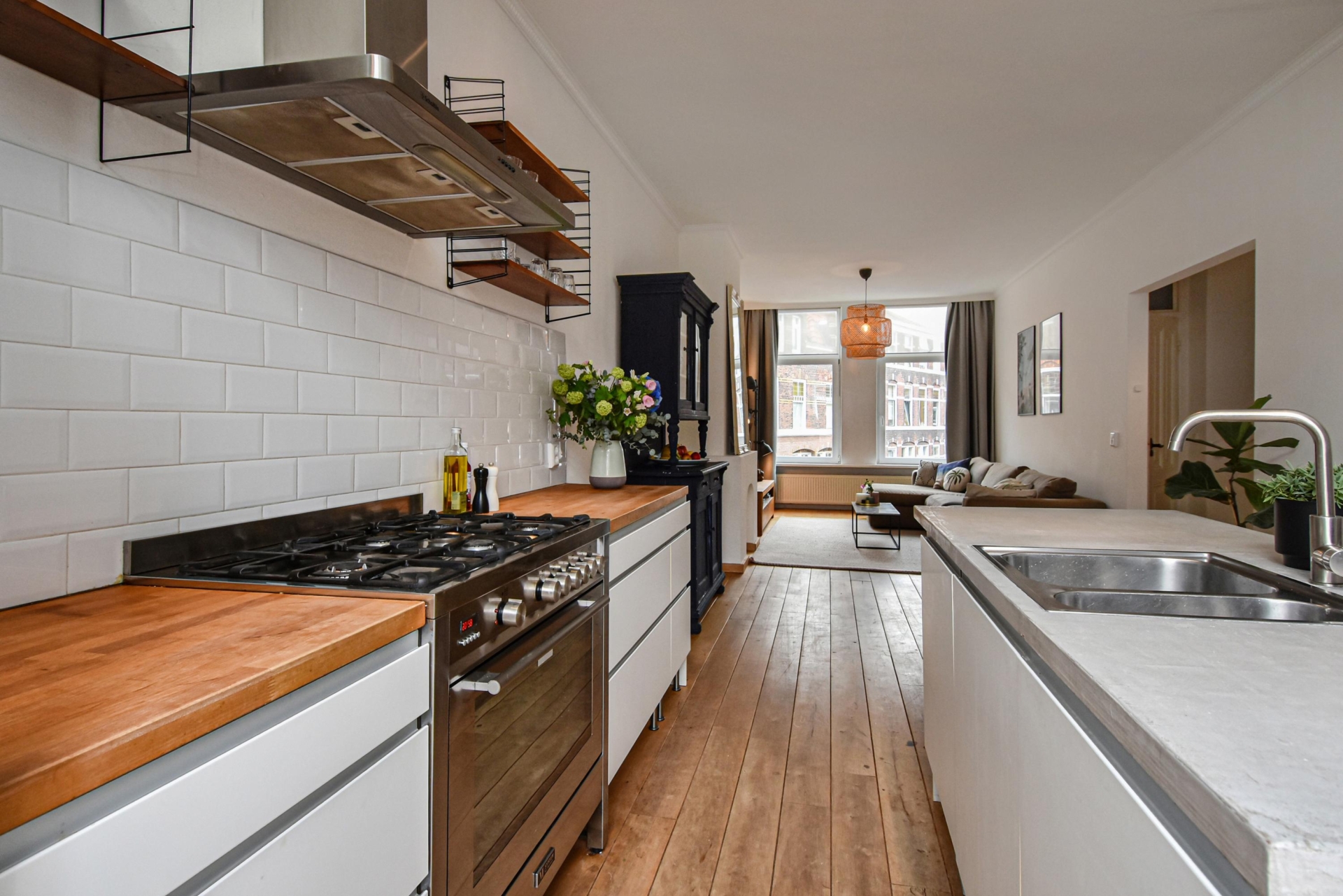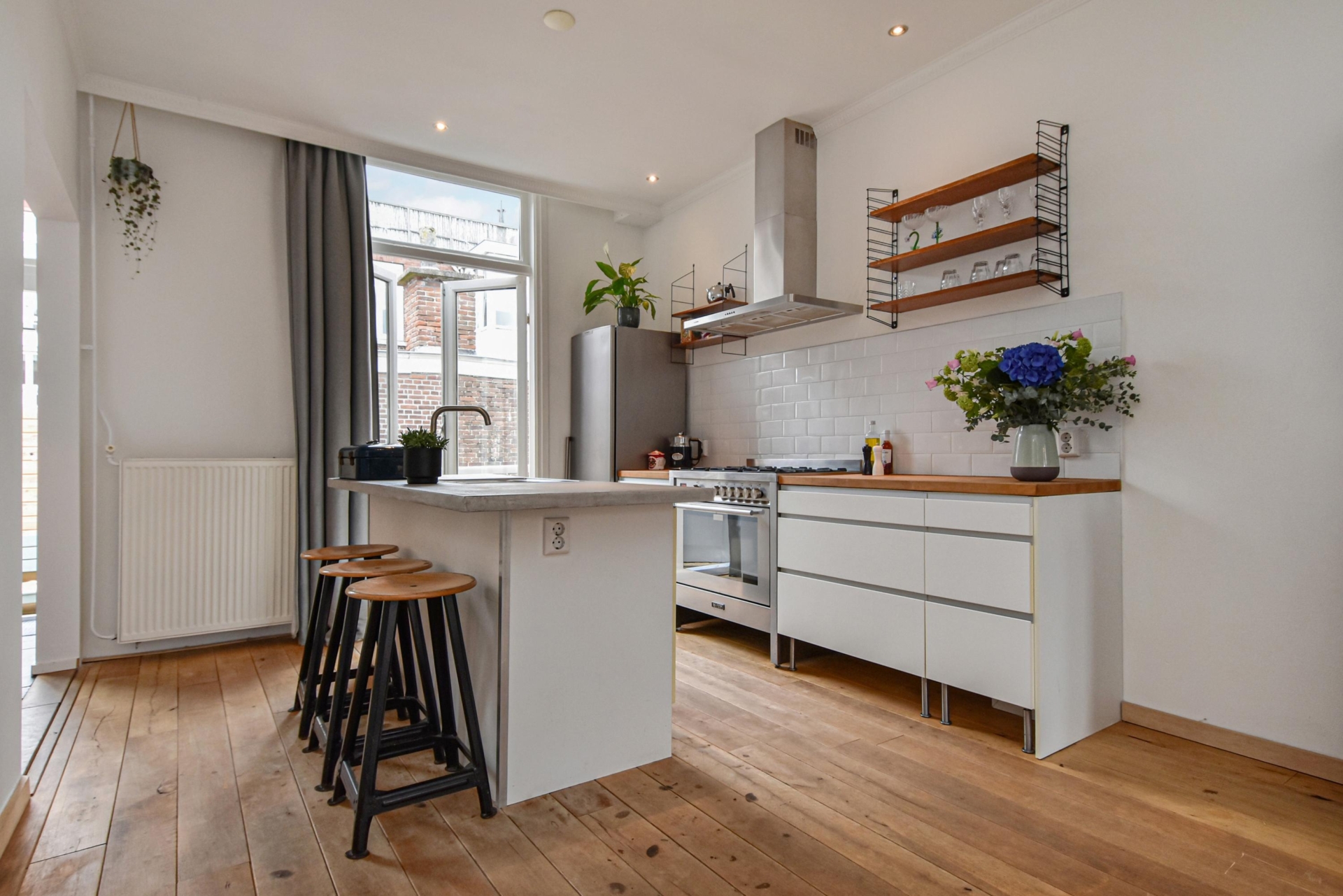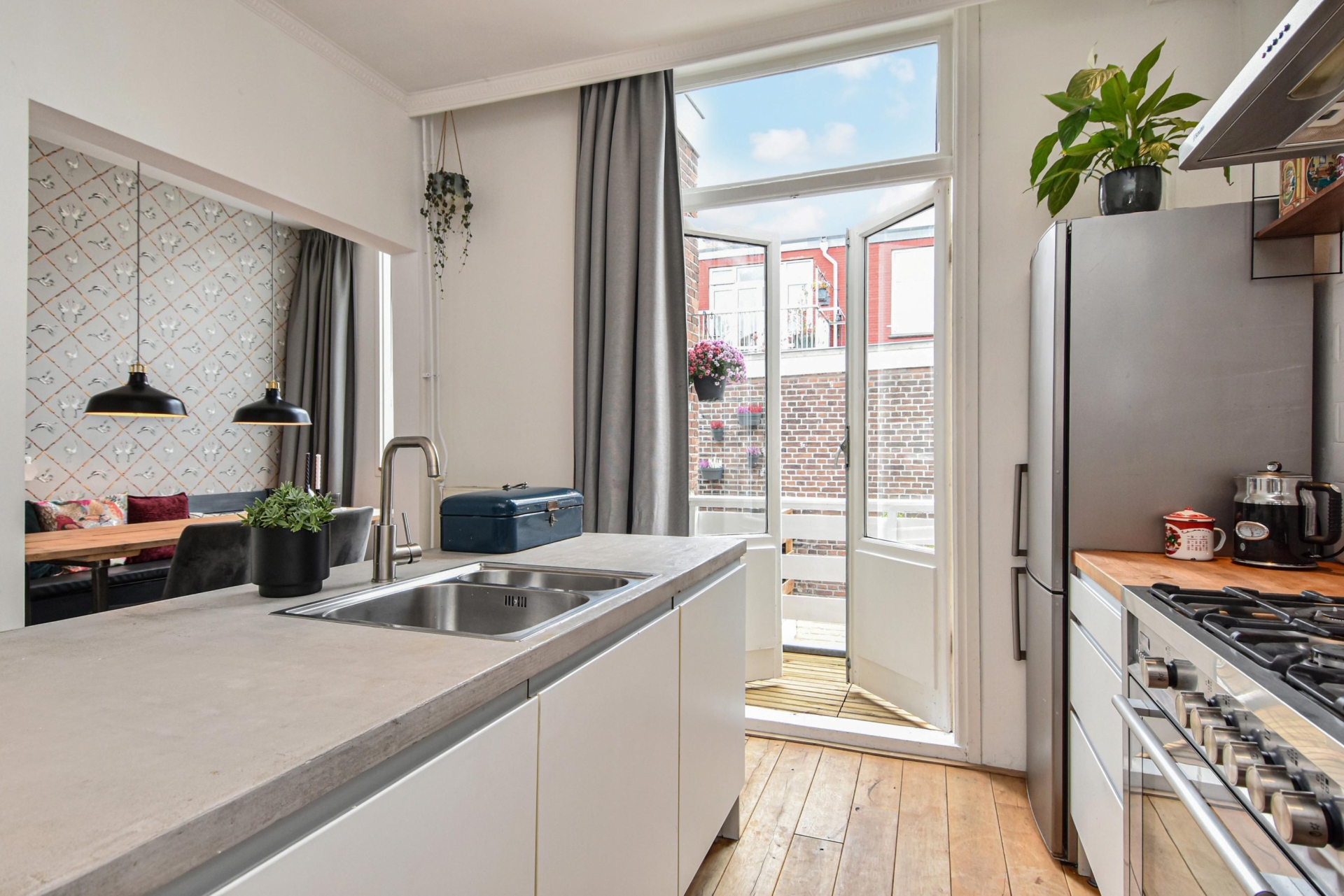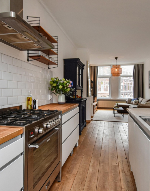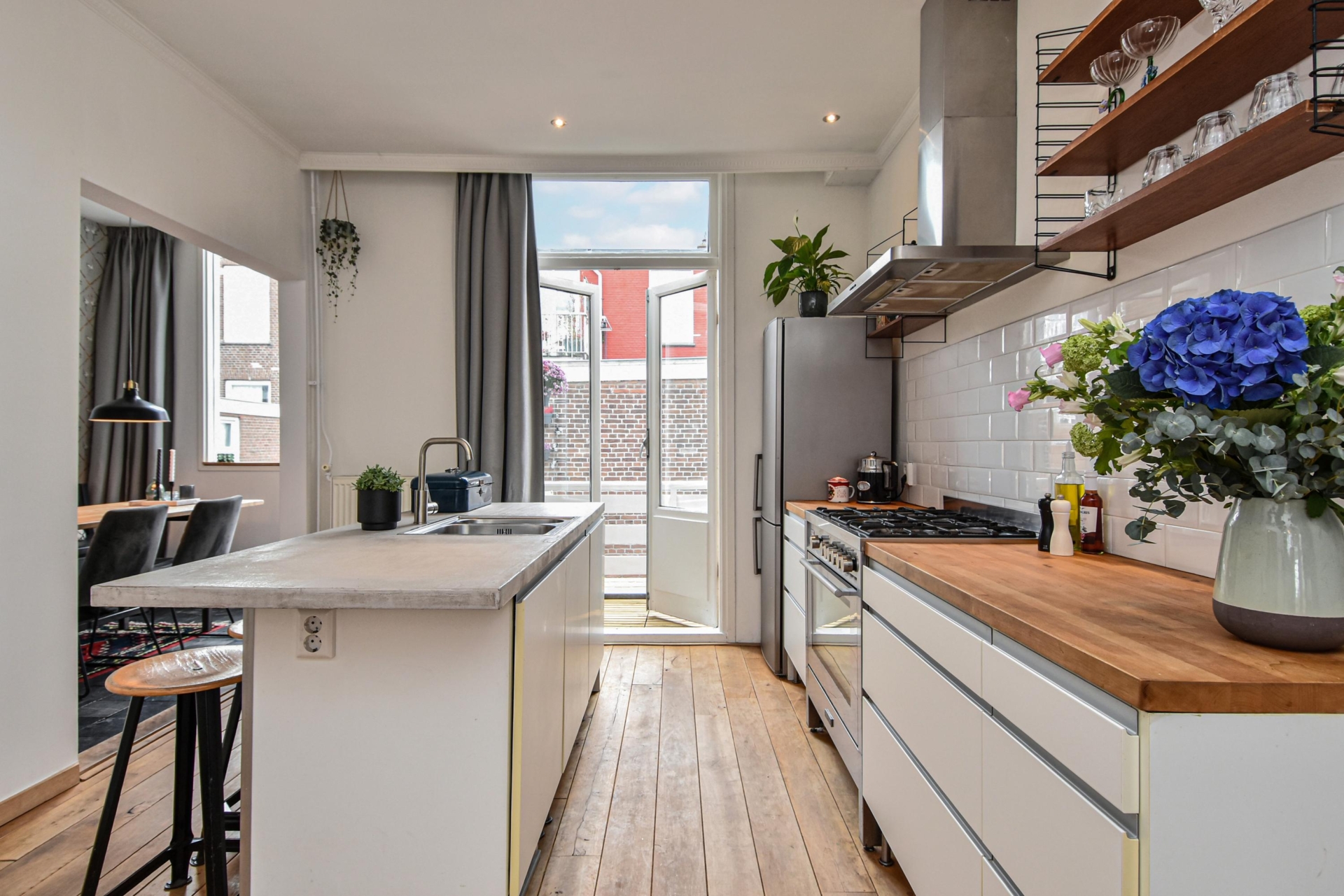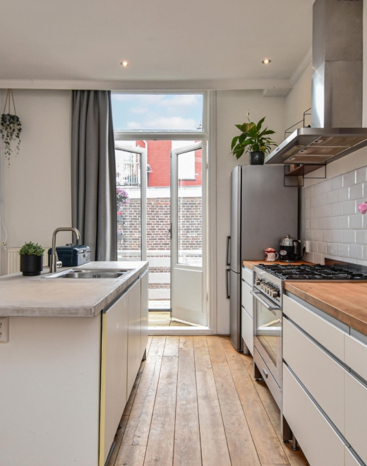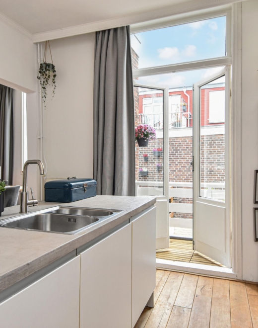 Aan de achterzijde ligt de open keuken die van alle gemakken is voorzien: een 5-pits gasfornuis, losse koelkast, vaatwasser, dubbele spoelbak en een afzuigkap. Vanuit de keuken zijn er openslaande deuren naar een knus balkonnetje aan de achterzijde.