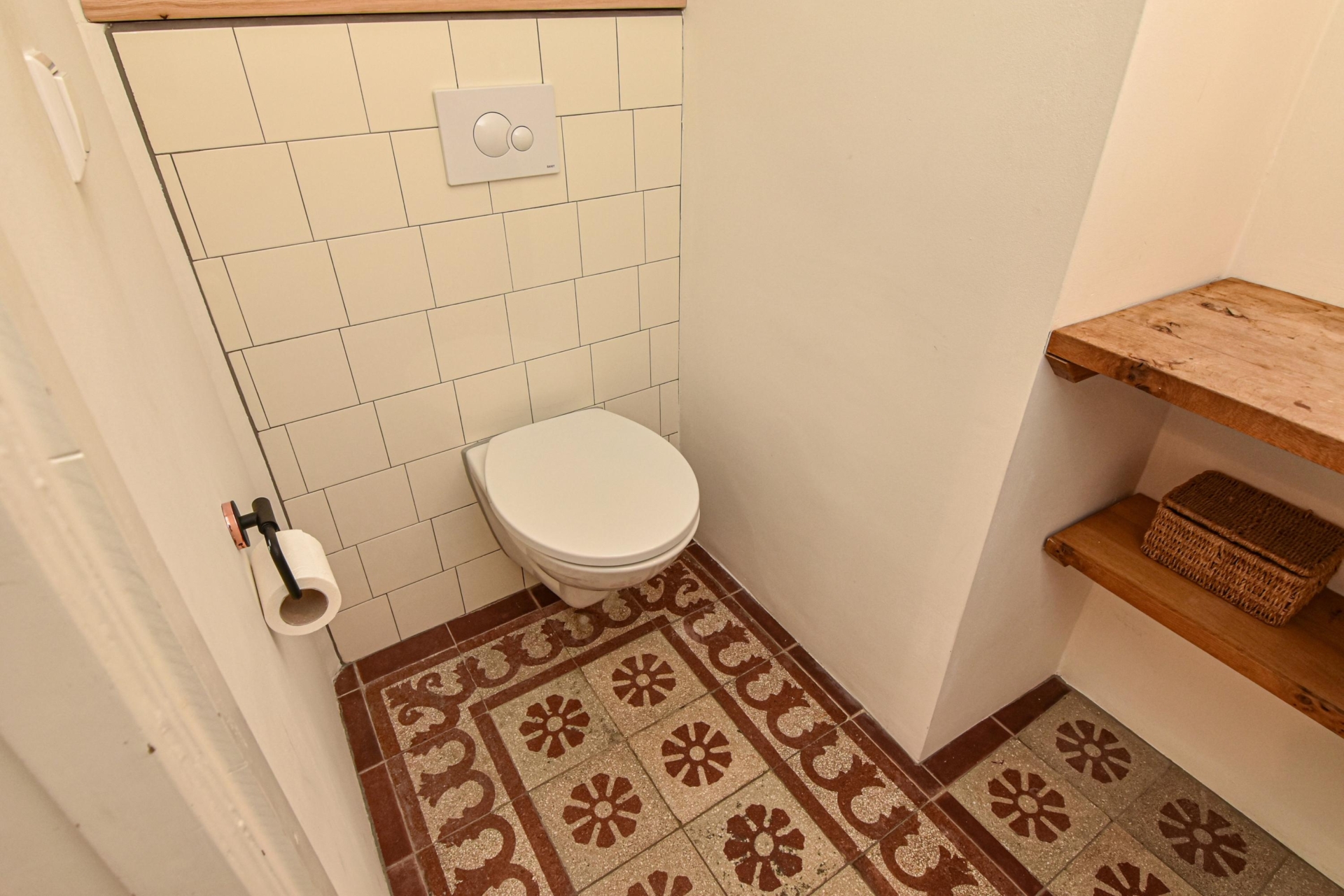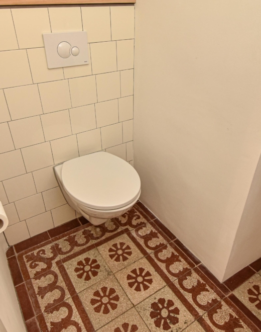 The first floor features a beautiful oak floor that continues seamlessly through the living room and hallway. Here, you’ll also find a built-in cupboard with a washing machine connection, as well as a spacious toilet with a small washbasin.