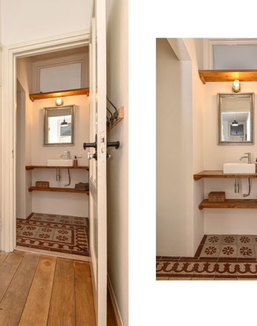 The bright living and dining area with open-plan kitchen, the modern bathroom, beautiful flooring, and authentic details all contribute to a warm and stylish atmosphere.