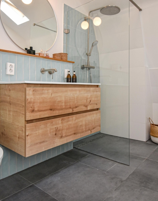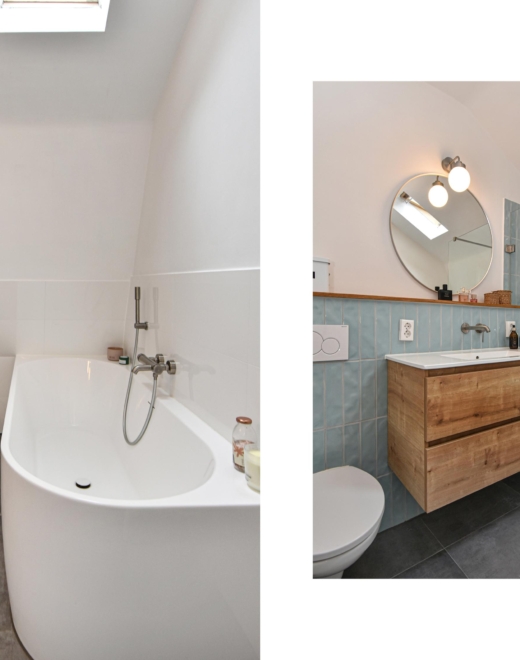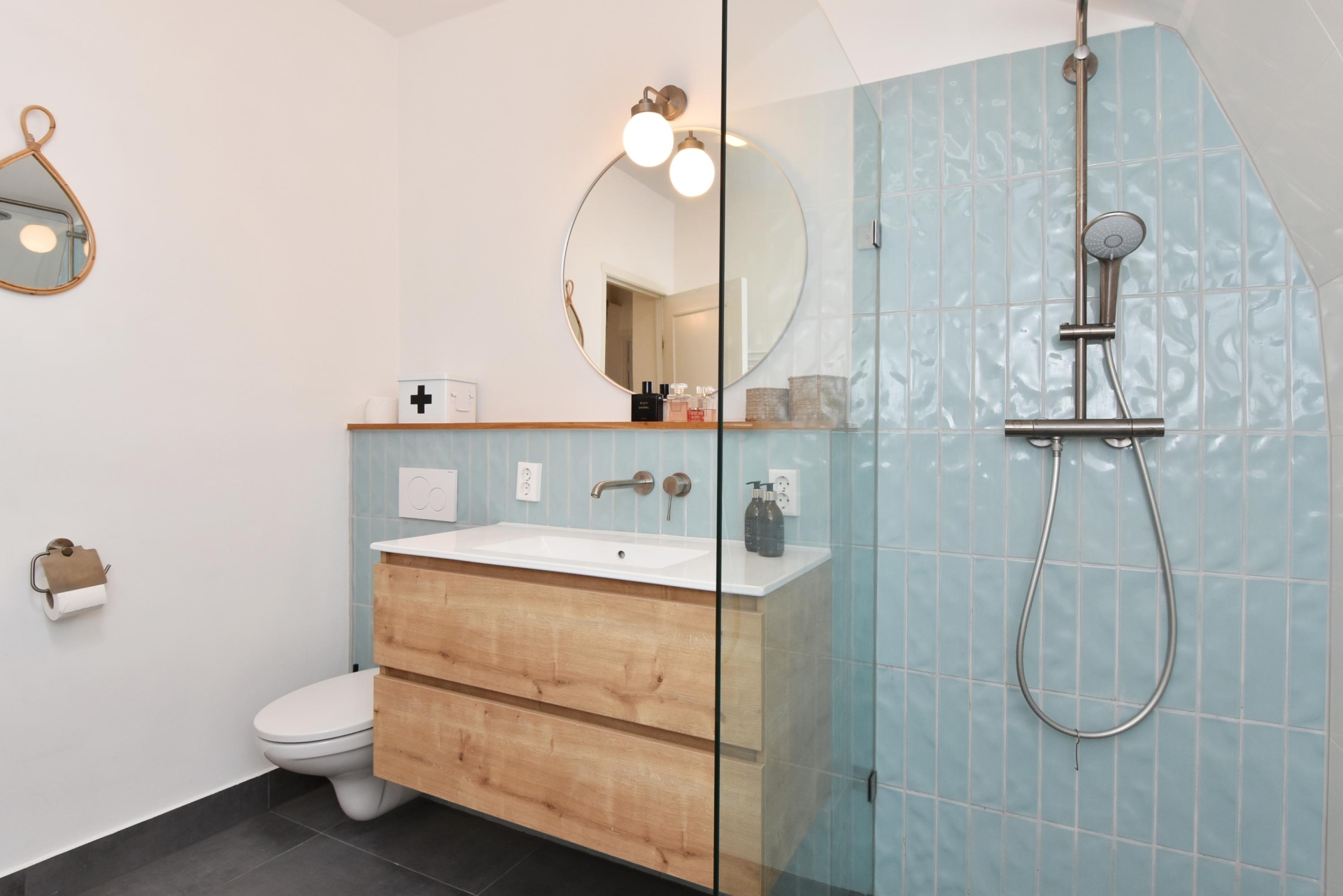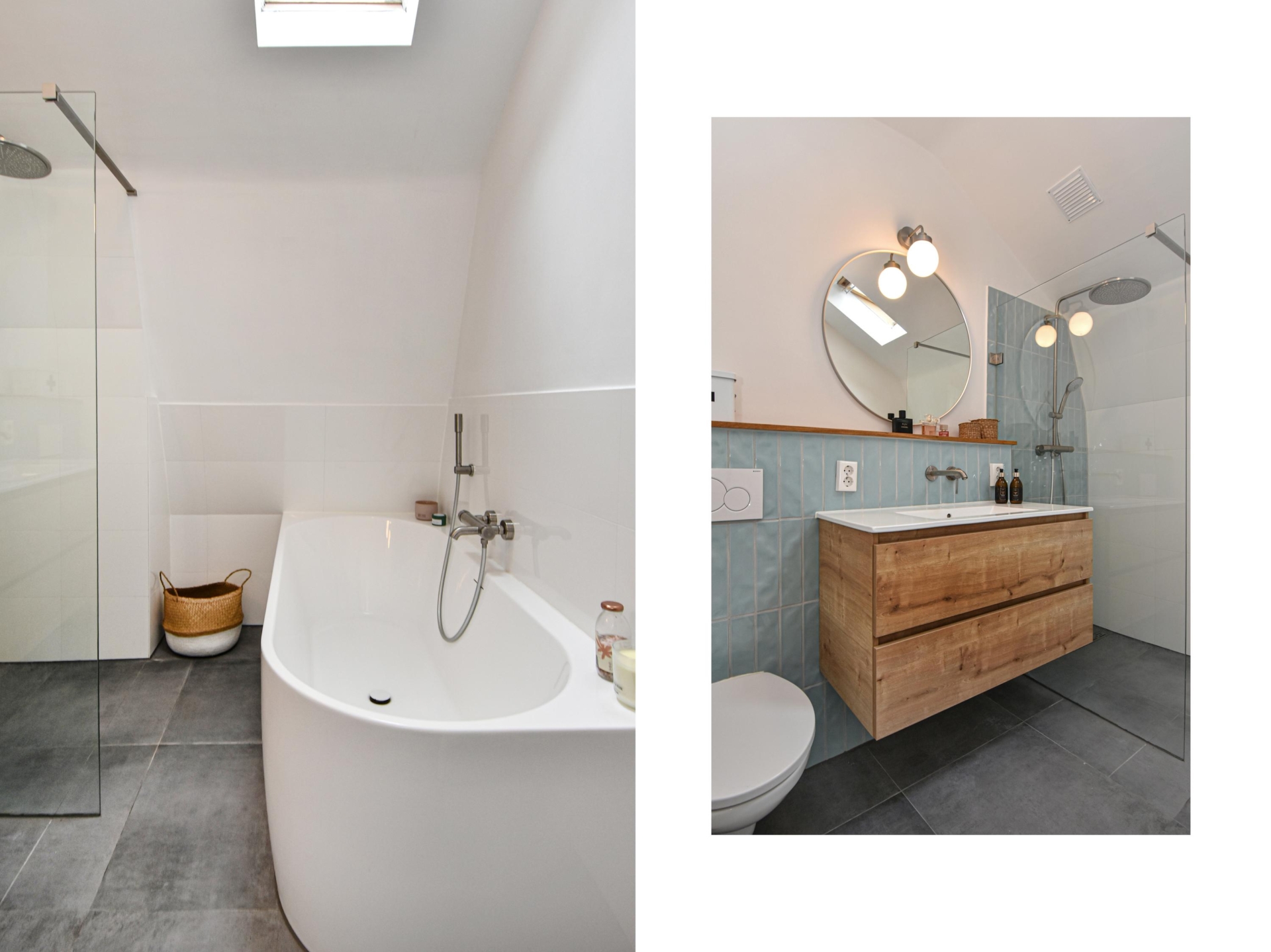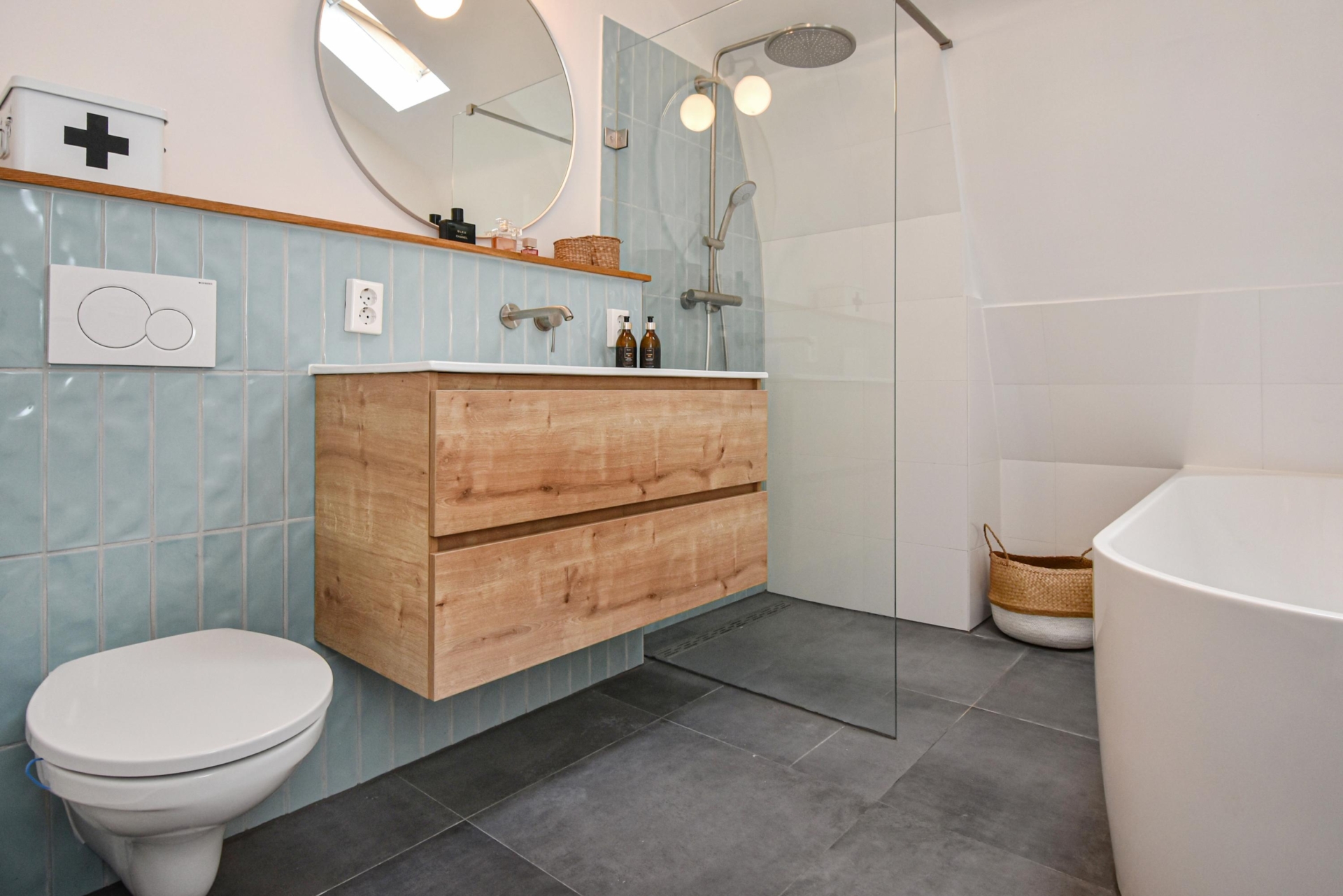 De moderne badkamer is smaakvol ingericht en voorzien van een tweede toilet, wastafelmeubel, inloopdouche, ligbad, designradiator en een dakraam dat zorgt voor extra daglicht.