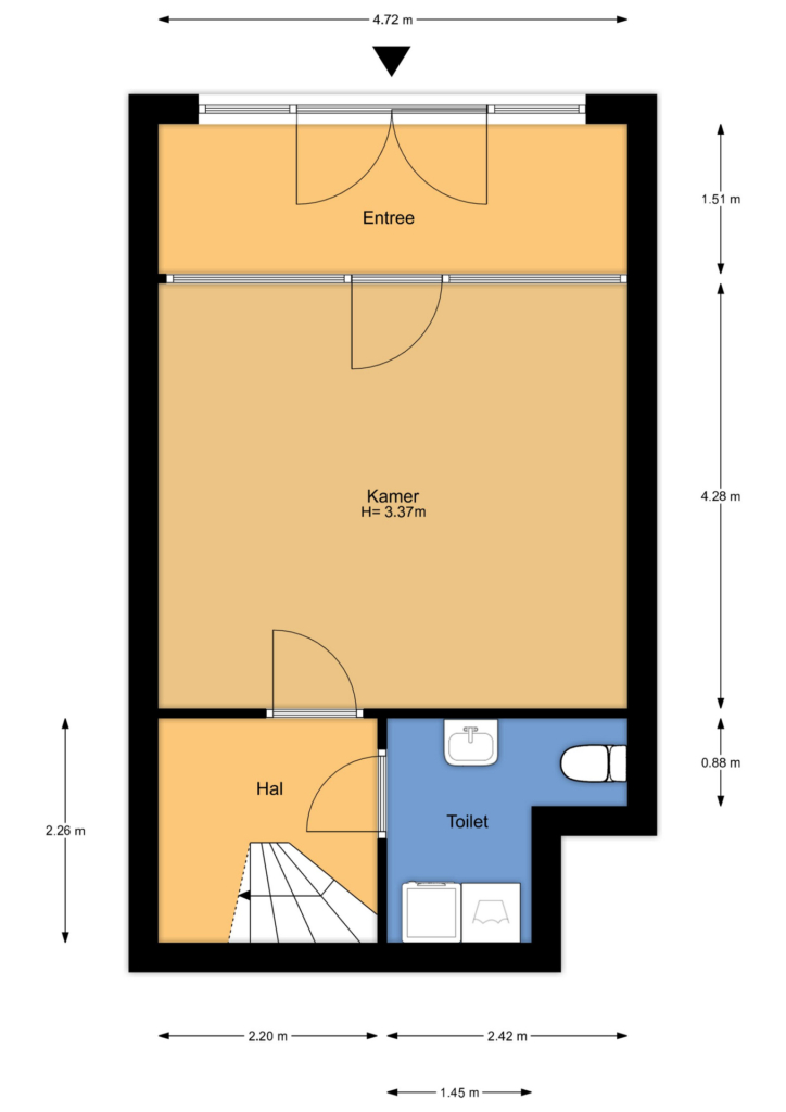 Via de voortuin kom je in een royale hal. Vanuit de glazen pui kom je vervolgens in de ruime slaapkamer/ studio/ atelier/ kantoor-/ praktijk-/ hobbyruimte met een plafondhoogte van ca. 3,35m.