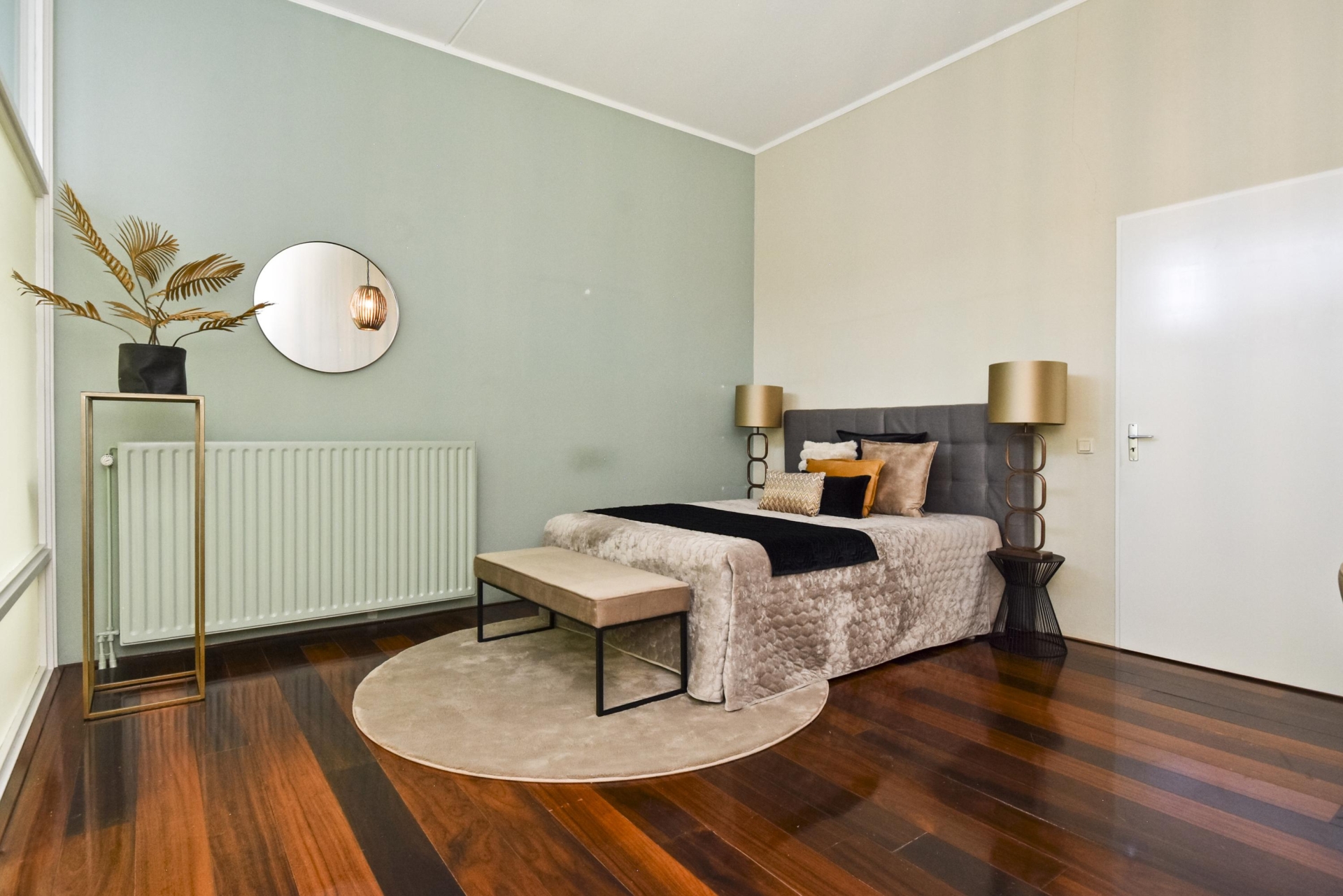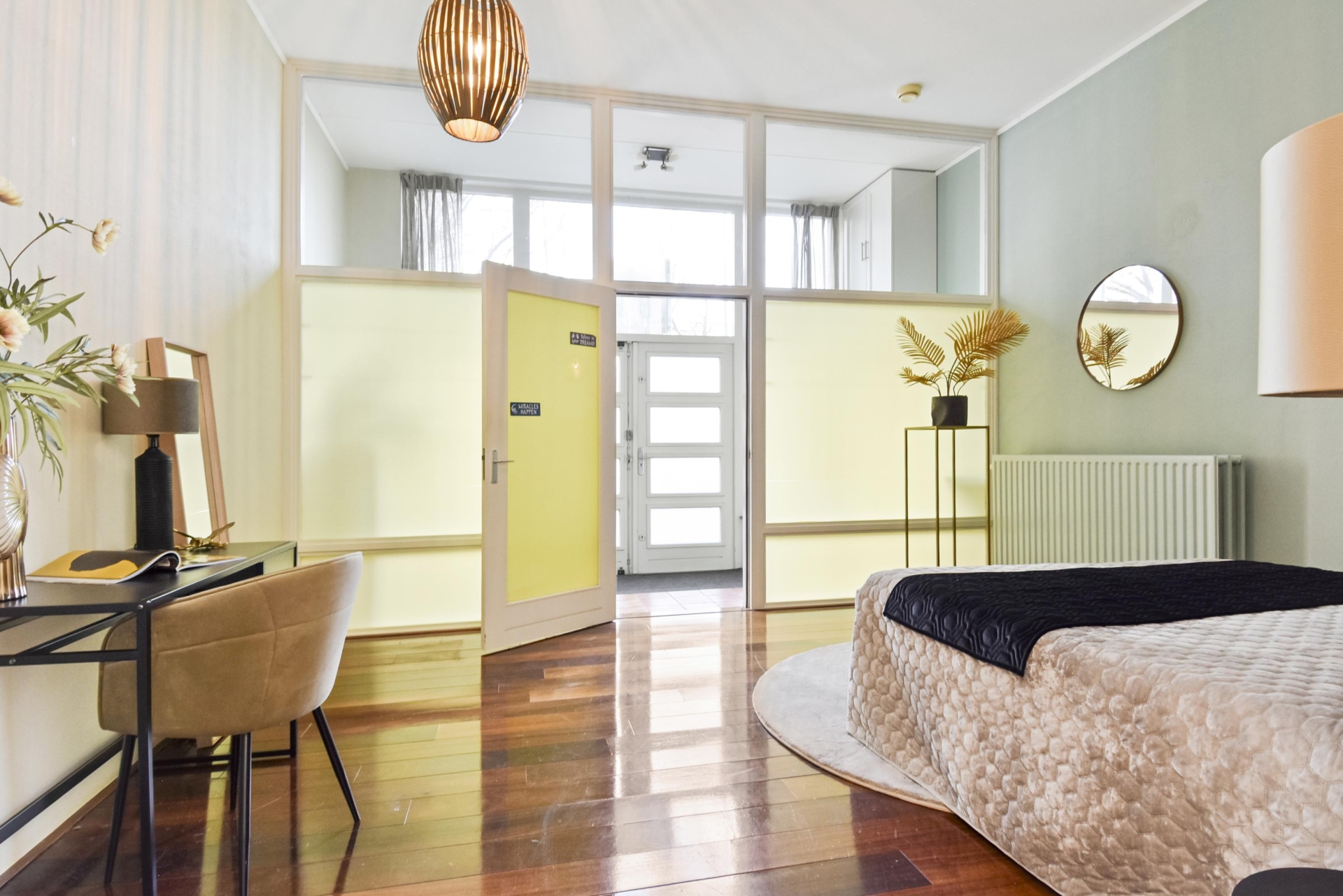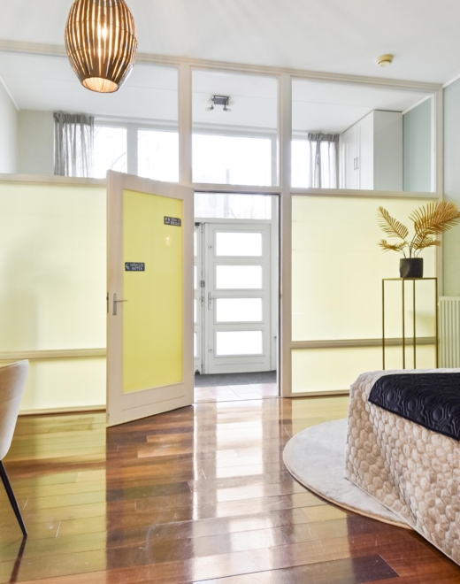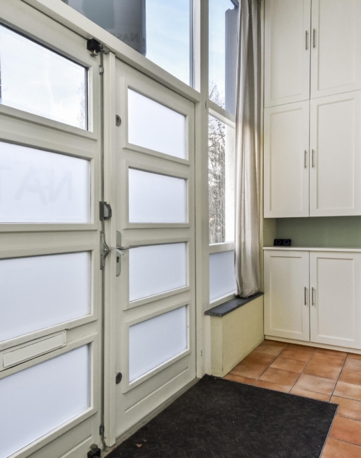 The front garden leads to a spacious entrance hall. Through a glass partition, you enter the generous bedroom/studio/atelier/office/practice or hobby space, featuring an impressive ceiling height of approximately 3.35 metres.