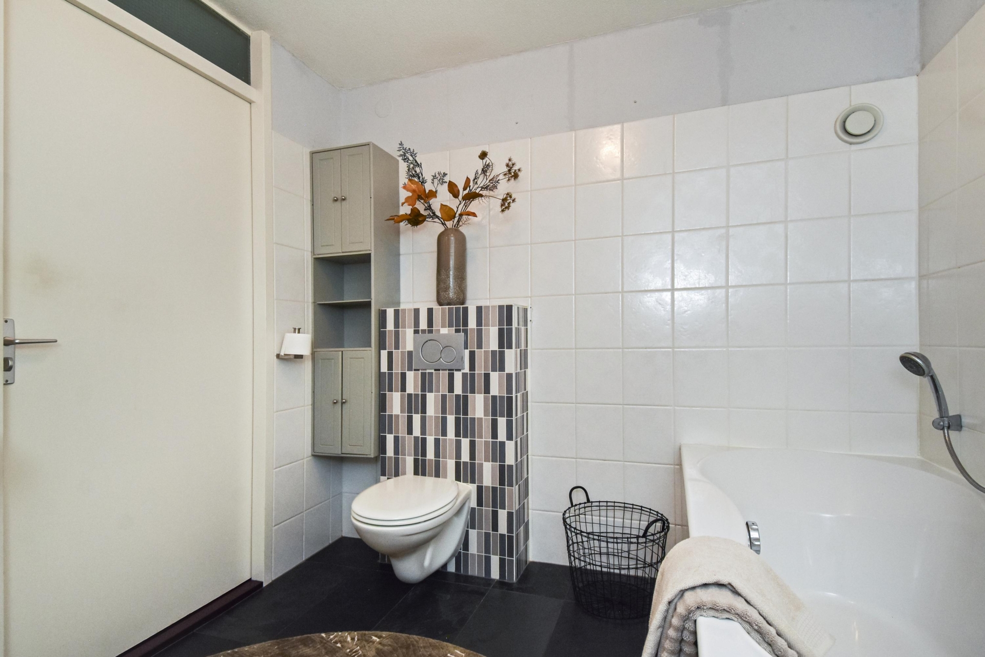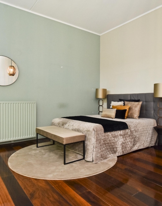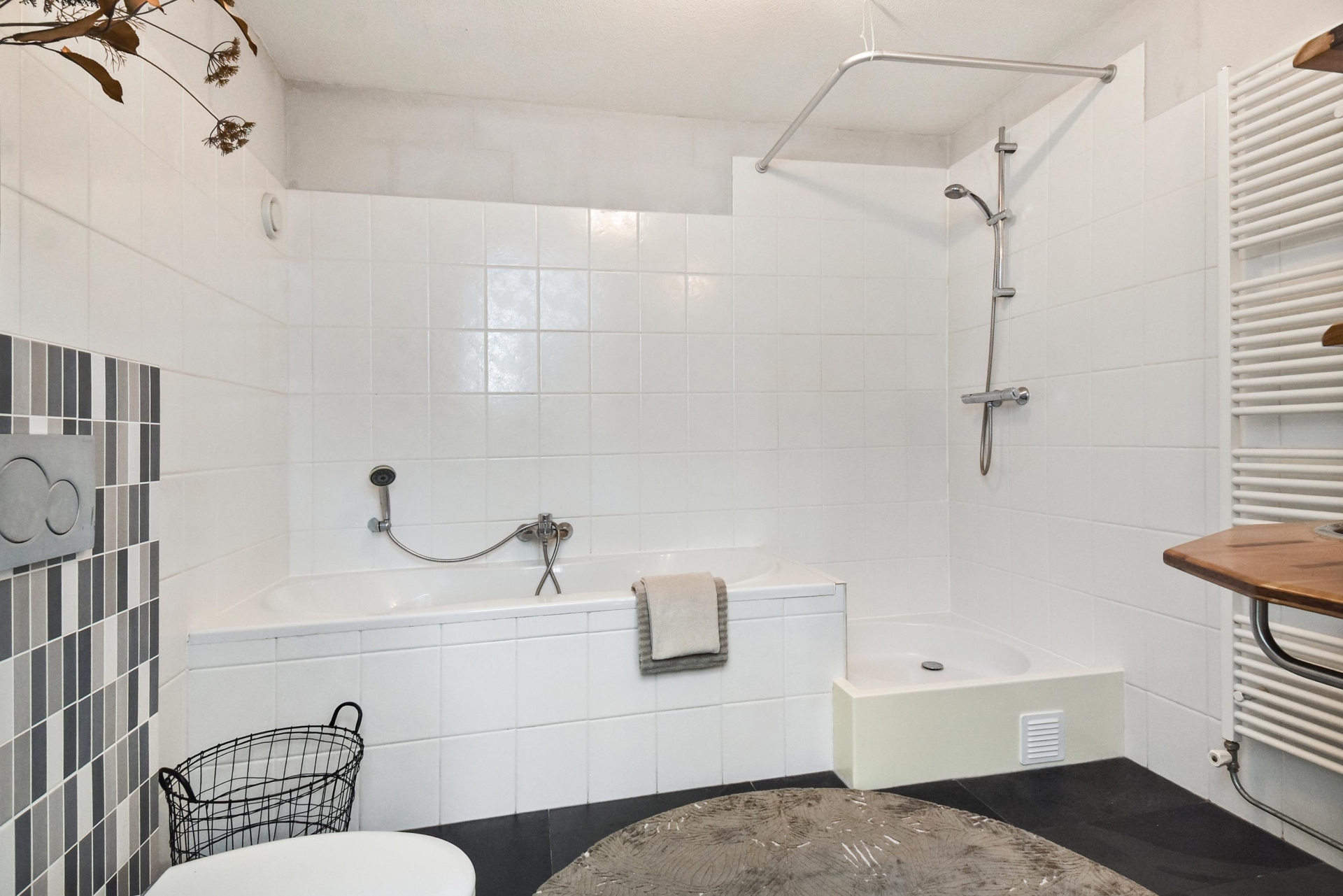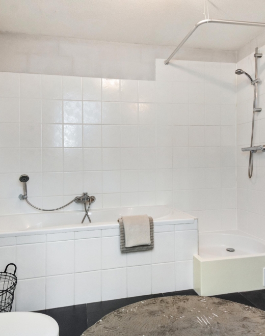 This floor also features a spacious and modern bathroom, equipped with a bathtub, separate shower, wall-mounted toilet, washbasin and towel radiator.