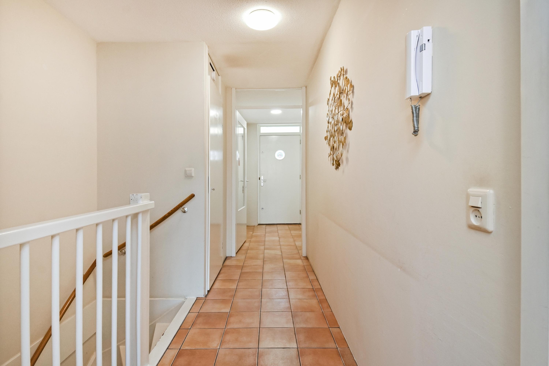 The property can also be accessed on the second floor, where you enter a spacious hallway with a tiled toilet with washbasin and a deep technical/storage cupboard.