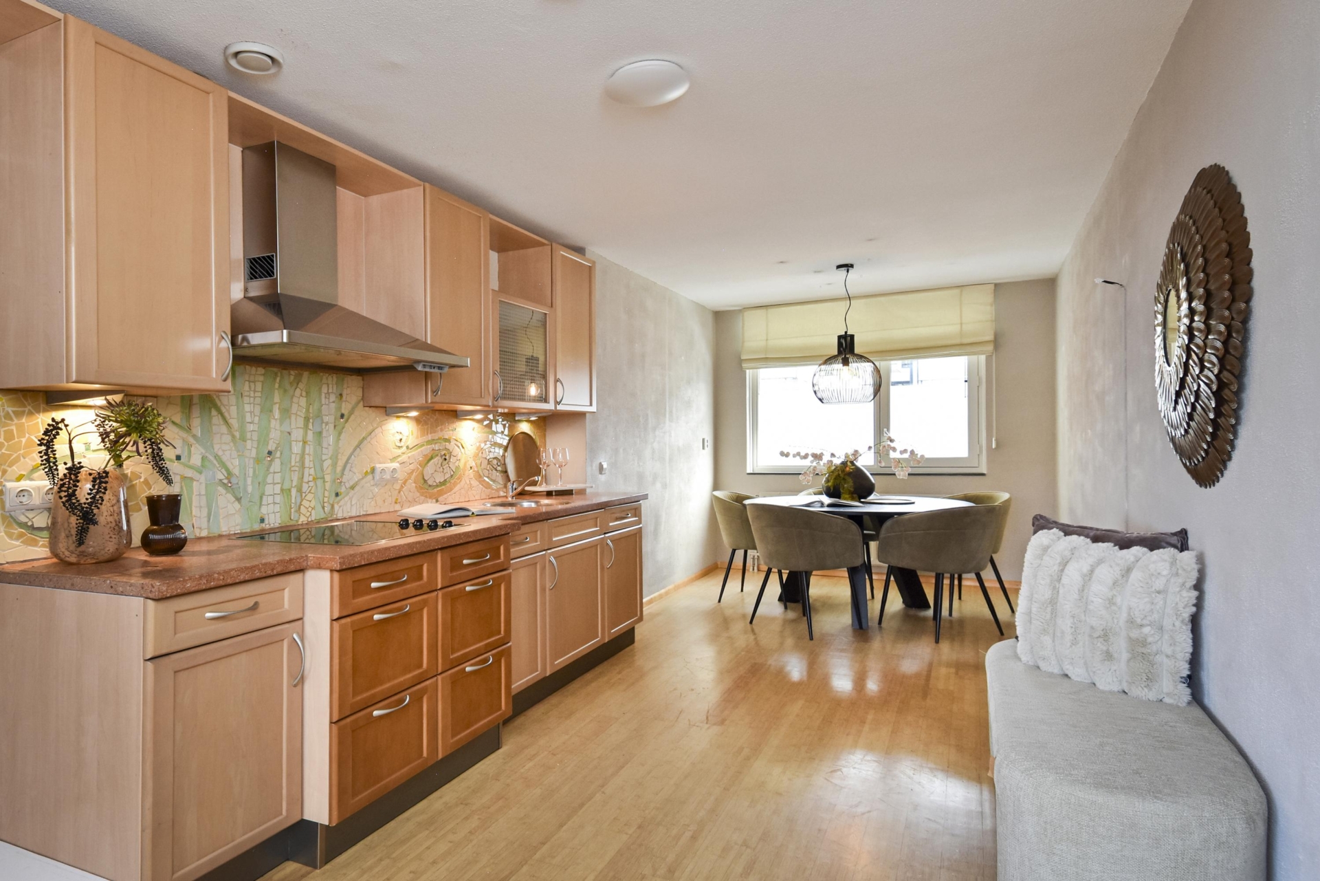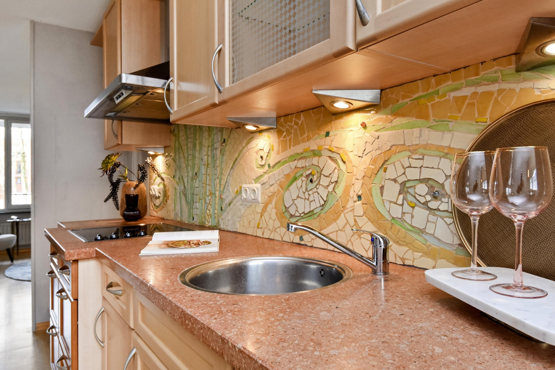 Aan de achterzijde is een grote woonkeuken voorzien van een keukenblok met een natuurstenen aanrechtblad, een 4-pits keramische kookplaat en een afzuigkap. De achterwand is gedecoreerd met een handgemaakte mozaïek.