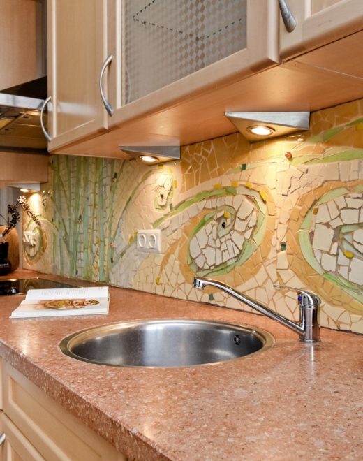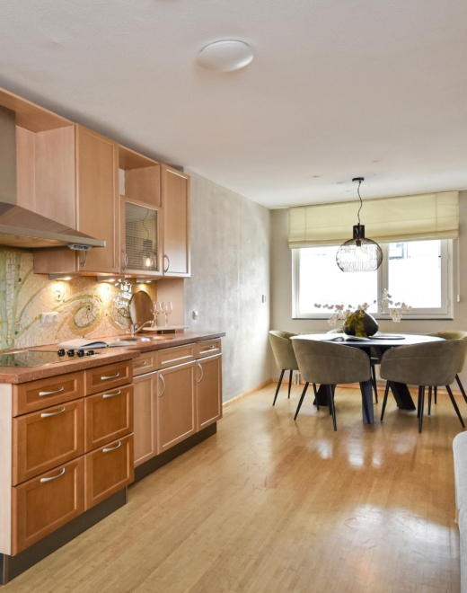 At the rear, you will find a generous open-plan kitchen, fitted with a kitchen unit featuring a natural stone worktop, a four-burner ceramic hob and an extractor hood. The backsplash is finished with a decorative handmade mosaic.