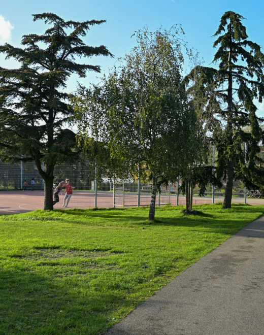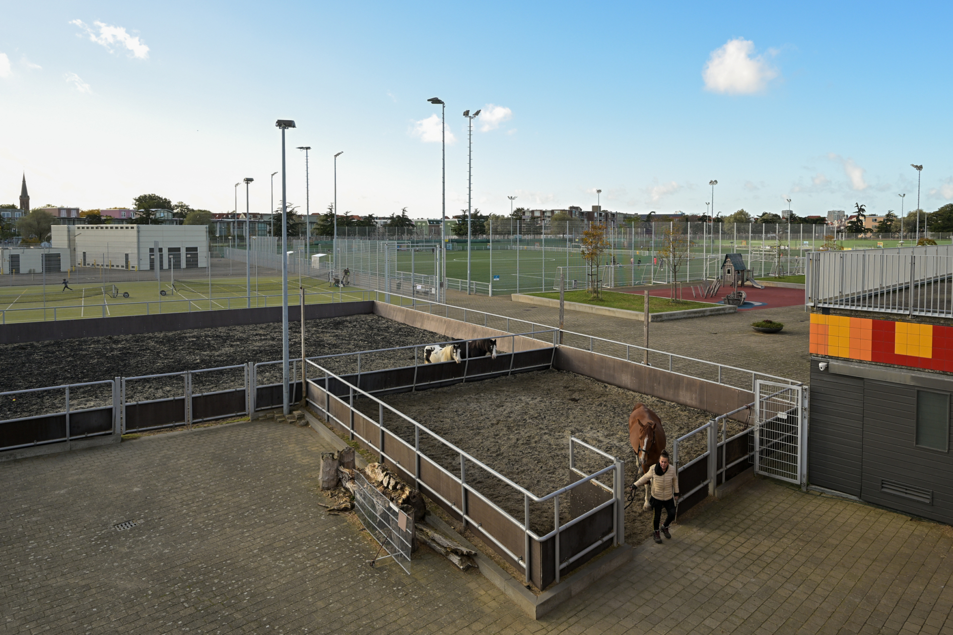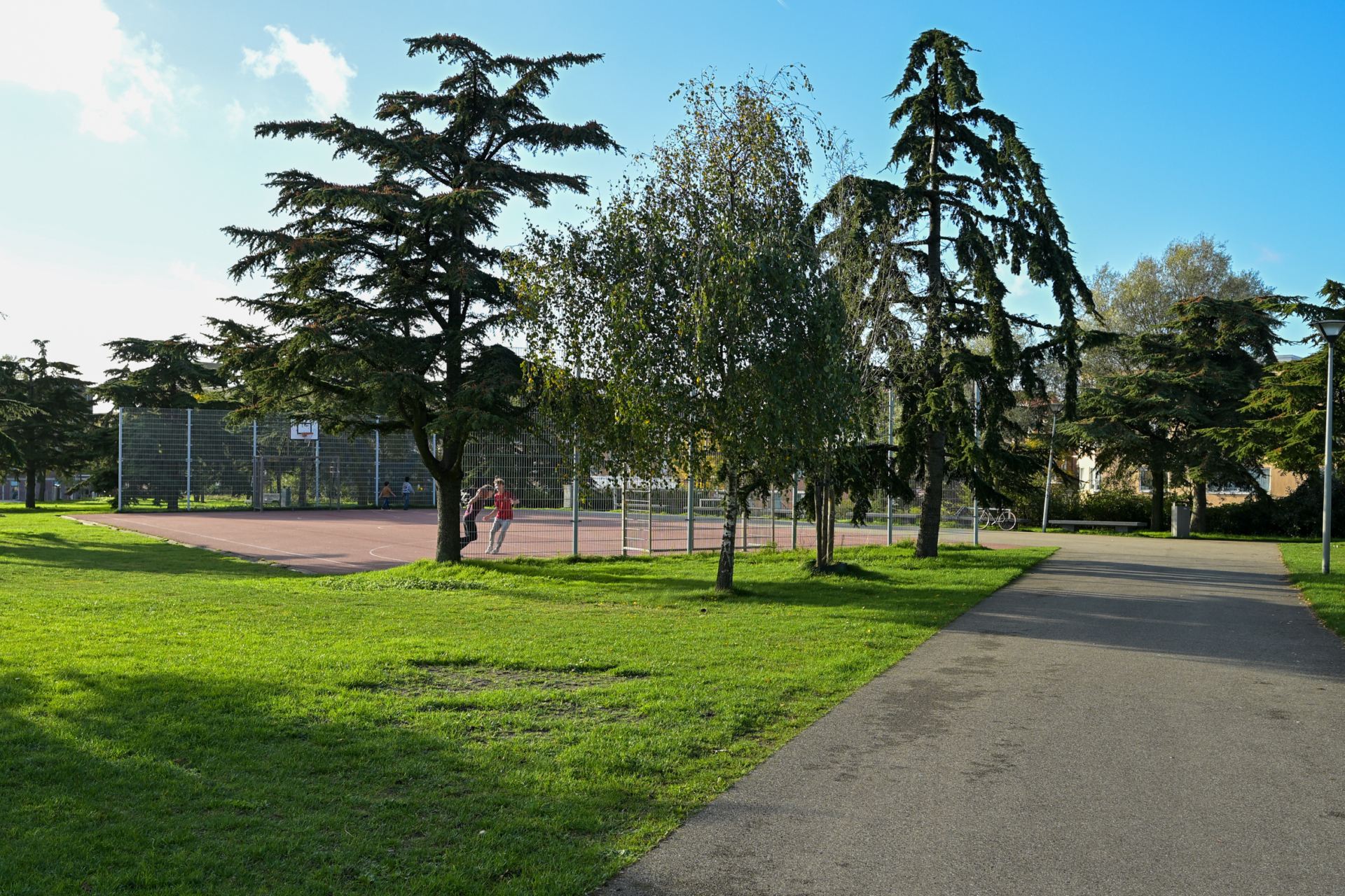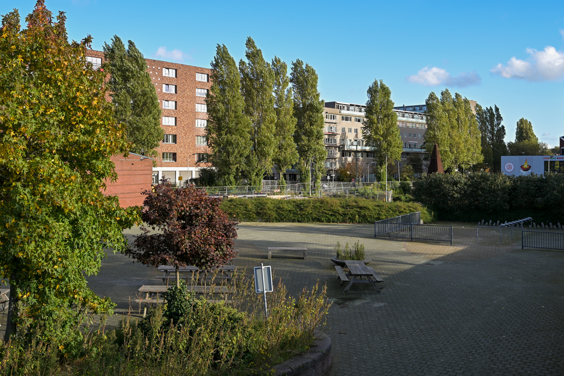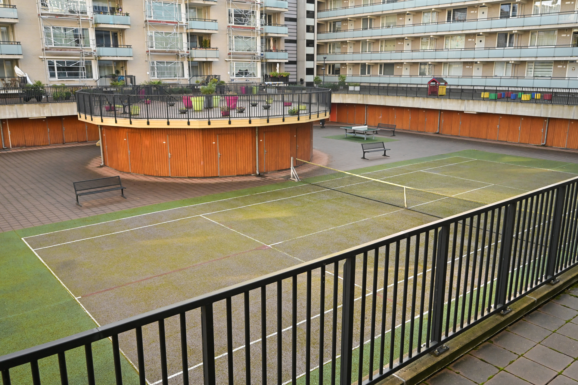– gemeenschappelijke binnenplaats met bloembakken, zitbanken, tennisbaan,