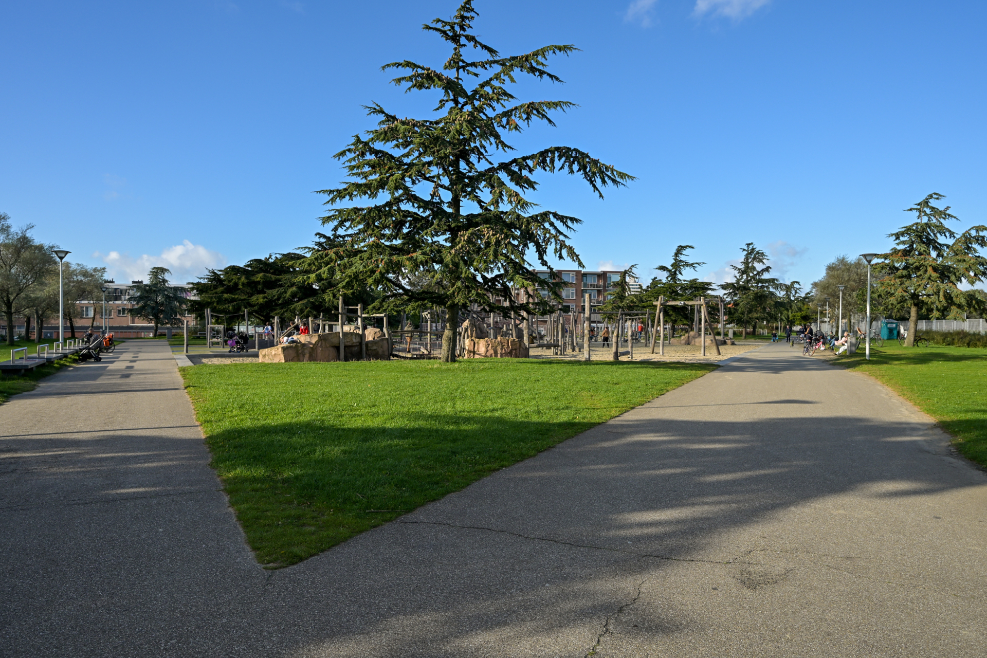 – communal courtyard featuring planters, seating areas, a tennis court, table tennis facilities and wooden playground equipment;